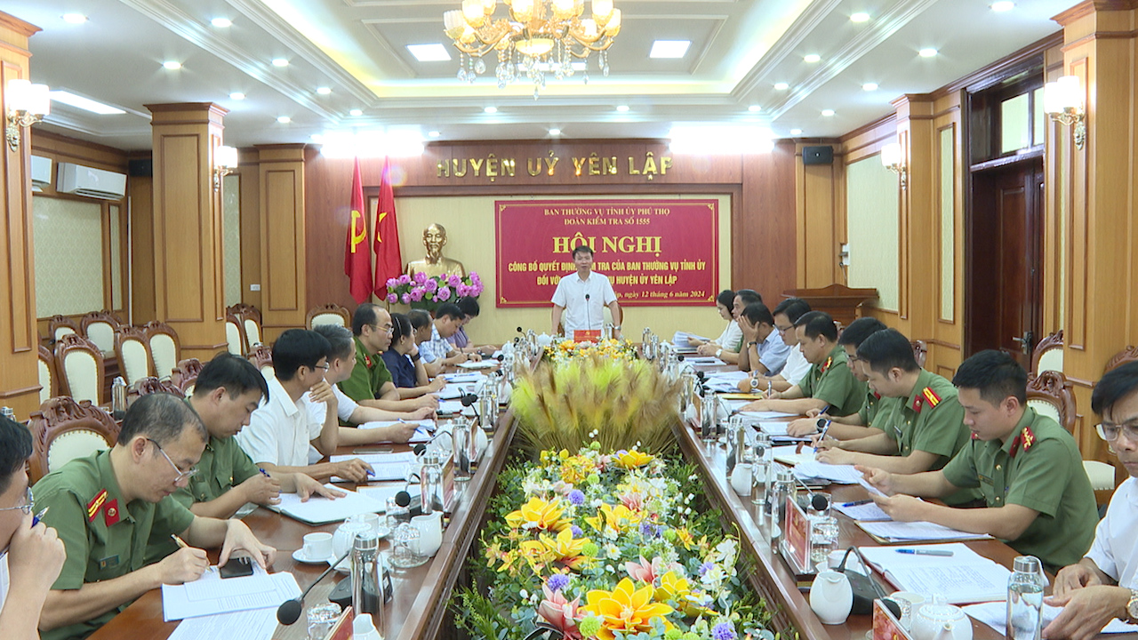 Ngày 12/6, Đoàn kiểm tra của Tỉnh uỷ Phú Thọ do đồng chí Đại tá Nguyễn Minh Tuấn - Uỷ viên BTV Tỉnh uỷ, Bí thư Đảng uỷ, Giám đốc Công an tỉnh làm trưởng đoàn đã làm việc với Huyện uỷ Yên Lập, công bố quyết định kiểm tra việc thực hiện Nghị quyết số 48-NQ/TU ngày 19/7/2021 của Ban Thường vụ Tỉnh ủy về nhiệm vụ bảo vệ an ninh quốc gia, bảo đảm trật tự, an toàn xã hội trên địa bàn huyện Yên Lập; gắn với thực hiện một số nghị quyết, chỉ thị của Trung ương và của tỉnh về bảo vệ an ninh chính trị, giữ gìn trật tự, an toàn xã hội trên địa bàn tỉnh Phú Thọ. Đại diện địa phương làm việc với Đoàn kiểm tra có đồng chí Nguyễn Thị Phương Hạnh, Uỷ viên BCH Đảng bộ tỉnh, Bí thư Huyện uỷ Yên Lập.
