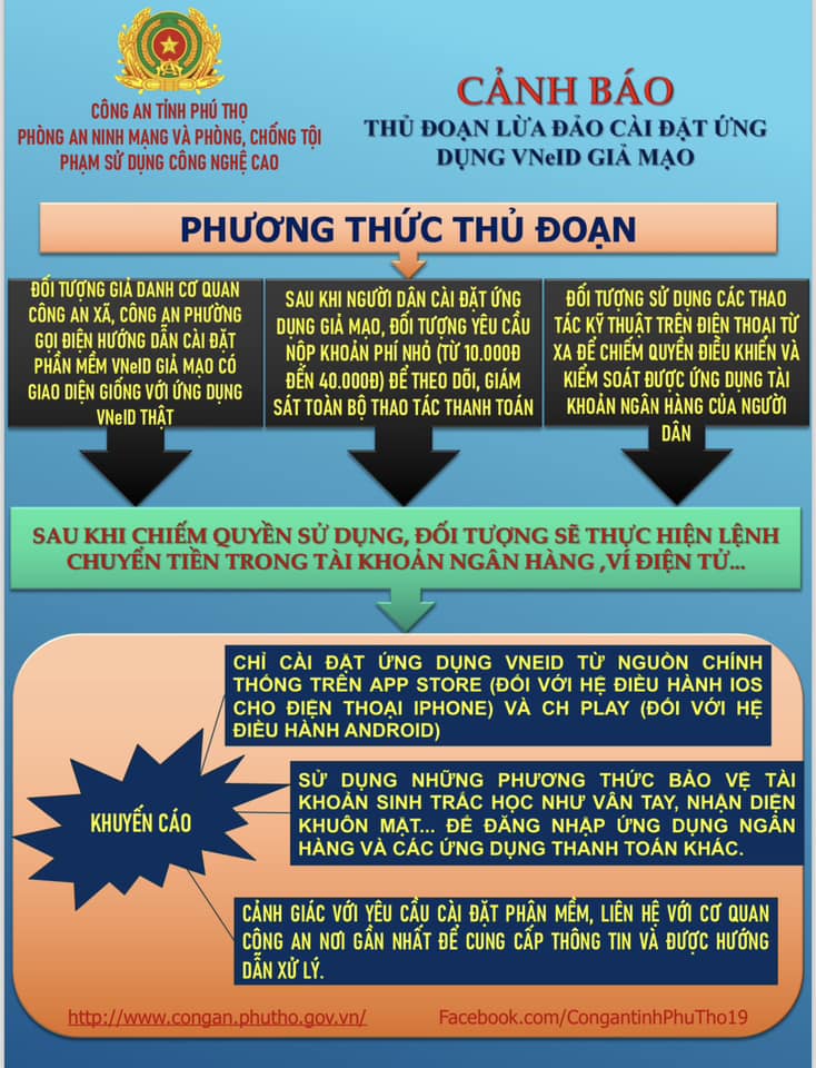 Thời gian gần đây xuất hiện các đối tượng lừa đảo giả danh Cơ quan Công an xã, công an phường gọi điện cho người dân hướng dẫn cài đặt VNeID giả mạo, kích hoạt tài khoản định danh điện tử. Sau khi người dân cài đặt VNeID giả mạo, đối tượng sẽ yêu cầu cấp quyền truy cập điện thoại, thực hiện lệnh chuyển tiền...
