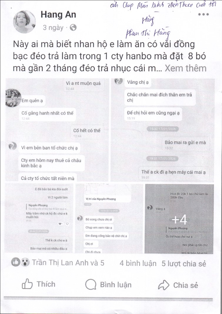 Ngày 05/02/2026 và 06/02/2026, qua công tác rà soát trên địa bàn Khu công nghiệp Bá Thiện 2, Đồn Công an Khu công nghiệp Bá Thiện phát hiện tài khoản cá nhân trên nền tảng Facebook mang tên “Hang An” đăng tải hai bài viết có nội dung phản ánh việc một doanh nghiệp chậm thanh toán tiền đặt hoa, sử dụng lời lẽ thiếu chuẩn mực, thông tin chưa được kiểm chứng.