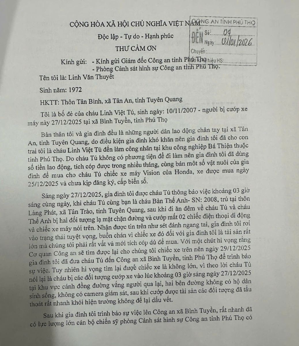 Với tinh thần trách nhiệm cao, triển khai quyết liệt các biện pháp nghiệp vụ, Phòng Cảnh sát hình sự Công an tỉnh Phú Thọ đã nhanh chóng điều tra, làm rõ vụ cướp tài sản nghiêm trọng xảy ra trên địa bàn, kịp thời bắt giữ các đối tượng gây án, thu hồi tài sản cho bị hại. Kết quả đó đã để lại ấn tượng sâu sắc trong lòng Nhân dân, thể hiện rõ tinh thần “vì Nhân dân phục vụ” của lực lượng Công an.