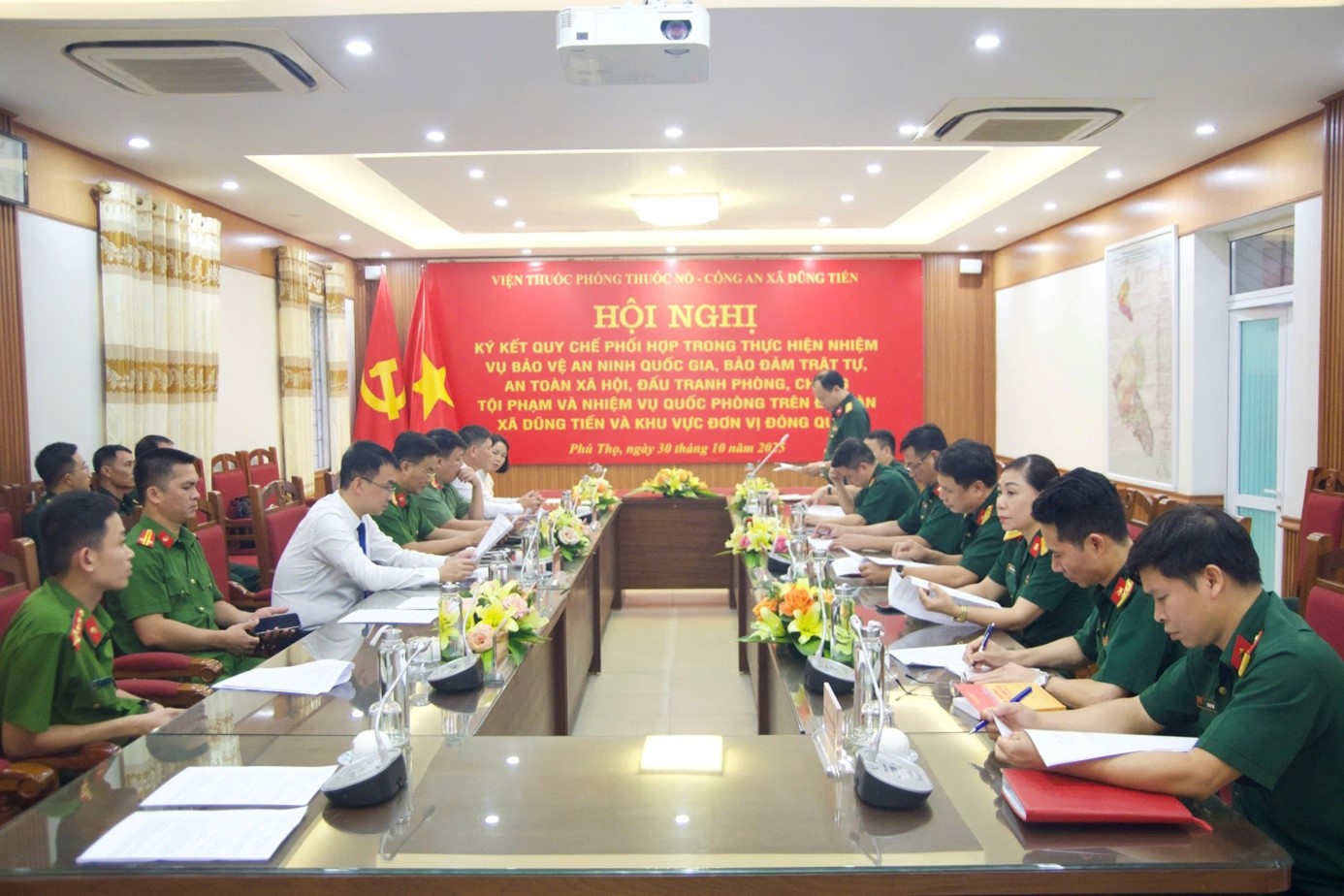 Ngày 30/10/2025, tại trụ sở Viện Thuốc phóng Thuốc nổ - Tổng cục Công nghiệp Quốc phòng, đã diễn ra Lễ ký kết Quy chế phối hợp giữa Công an xã Dũng Tiến và Viện Thuốc phóng Thuốc nổ trong việc thực hiện nhiệm vụ bảo vệ an ninh quốc gia, bảo đảm trật tự an toàn xã hội, đấu tranh phòng, chống tội phạm và thực hiện nhiệm vụ quốc phòng trên địa bàn xã Dũng Tiến và khu vực đơn vị đóng quân.