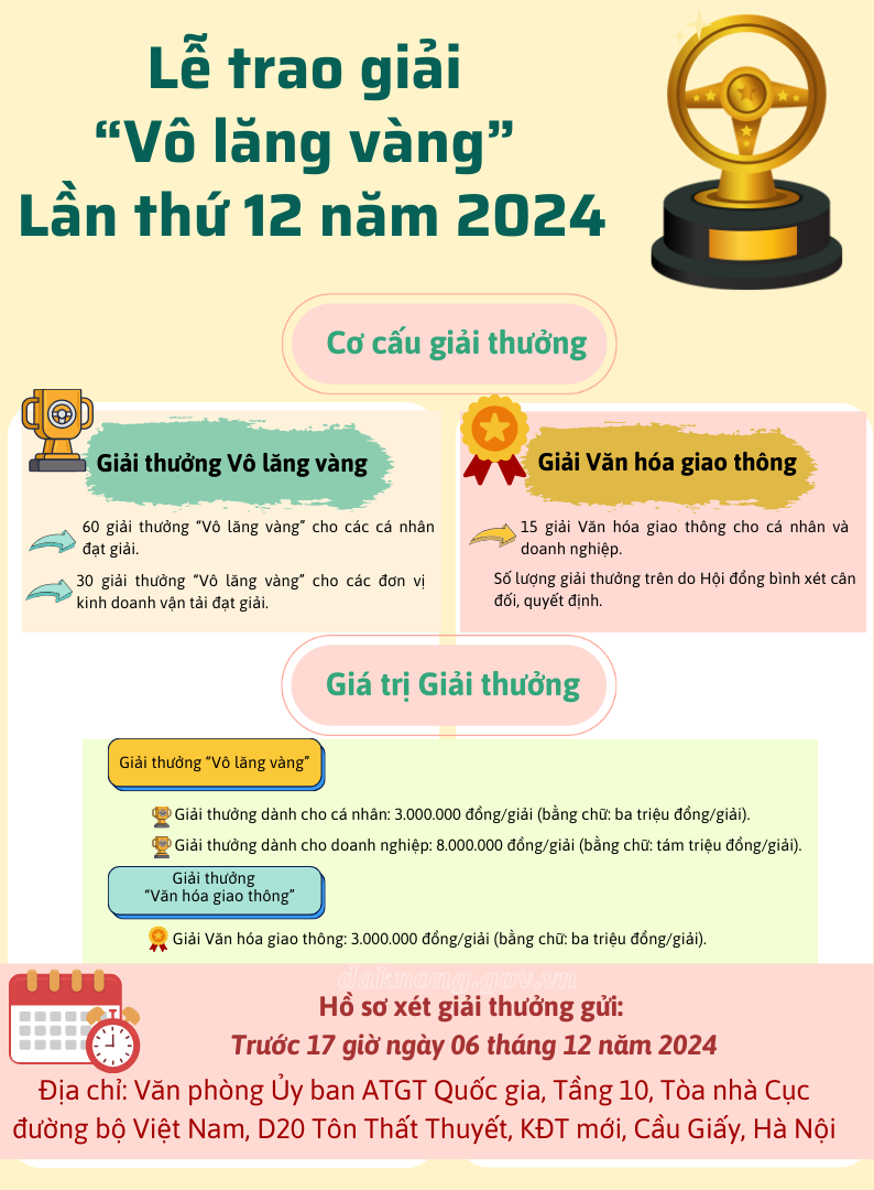 Giải thưởng “Vô lăng vàng” lần thứ 12 năm 2024 được tổ chức với mục đích tuyên truyền, nâng cao nhận thức trách nhiệm của các đơn vị kinh doanh vận tải và đội ngũ lái xe trong việc chấp hành pháp luật về trật tự, an toàn giao thông, phòng tránh tai nạn giao thông; góp phần thực hiện mục tiêu kiềm chế và kéo giảm tai nạn giao thông so với năm 2023; Qua đó, tăng cường vai trò, trách nhiệm của các đơn vị kinh doanh vận tải, đội ngũ lái xe trong công tác bảo đảm TTATGT và thực hiện Năm An toàn giao thông 2024 với chủ đề “ Thượng tôn pháp luật để xây dựng văn hóa giao thông an toàn” và ghi nhận và tôn vinh các lái xe, các đơn vị kinh doanh vận tải có nhiều đóng góp trong công tác đảm bảo trật tự, an toàn giao thông, giúp đỡ nạn nhân tai nạn giao thông. Thực hiện kế hoạch số 365/KH-UBATGTQG ngày 20/11/2024 của Ủy ban An toàn giao thông Quốc gia về tổ chức giải thưởng “Vô lăng vàng” lần thứ 12 năm 2024, Ban An toàn giao thông tỉnh Phú Thọ xây dựng Kế hoạch triển khai. Theo đó, thời gian nhận hồ sơ và đối tượng tham gia xét tặng giải thưởng “Vô lăng vàng” lần thứ 12 năm 2024 được quy định cụ thể: