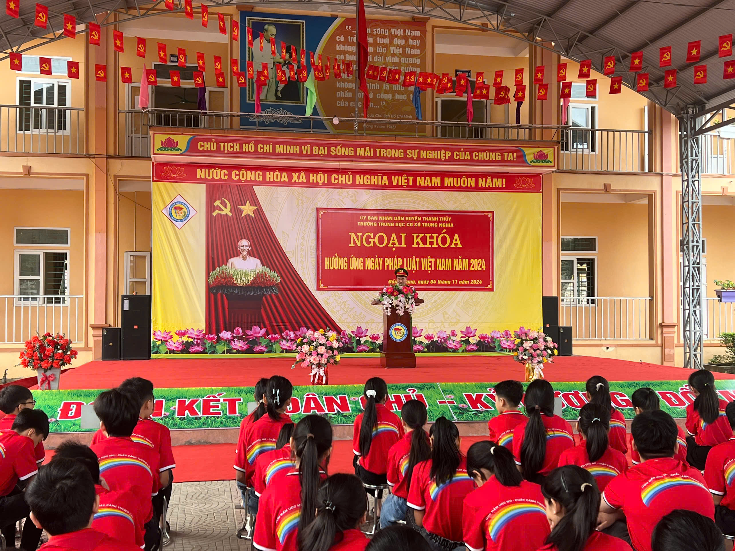 Ngày 04/11/2024, Công an xã Đồng Trung phối hợp với Công an huyện Thanh Thuỷ (Đội Điều tra tổng hợp) tổ chức tuyên truyền pháp luật tại Trường THCS Trung Nghĩa với toàn bộ học sinh và giáo viên nhà trường (330 học sinh, 21 giáo viên) về nội dung tình hình tội phạm trên địa bàn huyện Thanh Thuỷ nói chung và xã Đồng Trung nói riêng, nội dung tuyên truyền chủ yếu liên quan đến thanh thiếu niên và các biện pháp phòng ngừa.