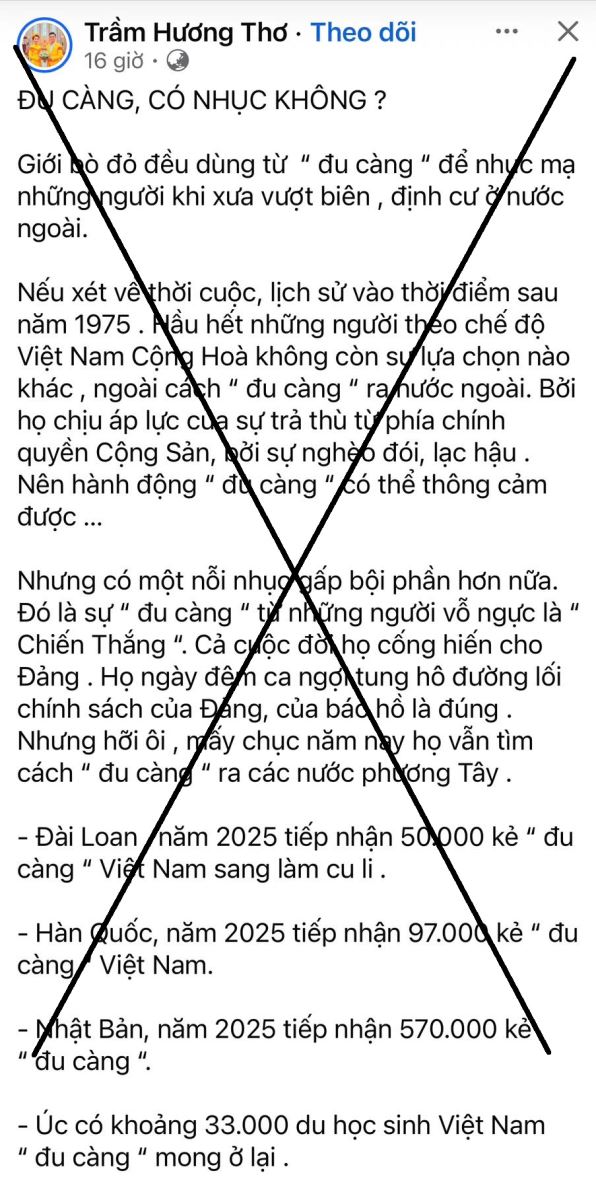 Thời gian gần đây, trên mạng xã hội xuất hiện bài viết của tài khoản Trầm Hương Thơ với tiêu đề “Đu càng, có nhục không?”, trong đó sử dụng ngôn từ miệt thị, quy chụp và xuyên tạc hiện tượng công dân Việt Nam ra nước ngoài học tập, lao động, cư trú hợp pháp. Dưới danh nghĩa “phân tích logic”, bài viết thực chất là một sự bóp méo lịch sử, đánh tráo khái niệm, kích động hằn thù và chia rẽ xã hội.