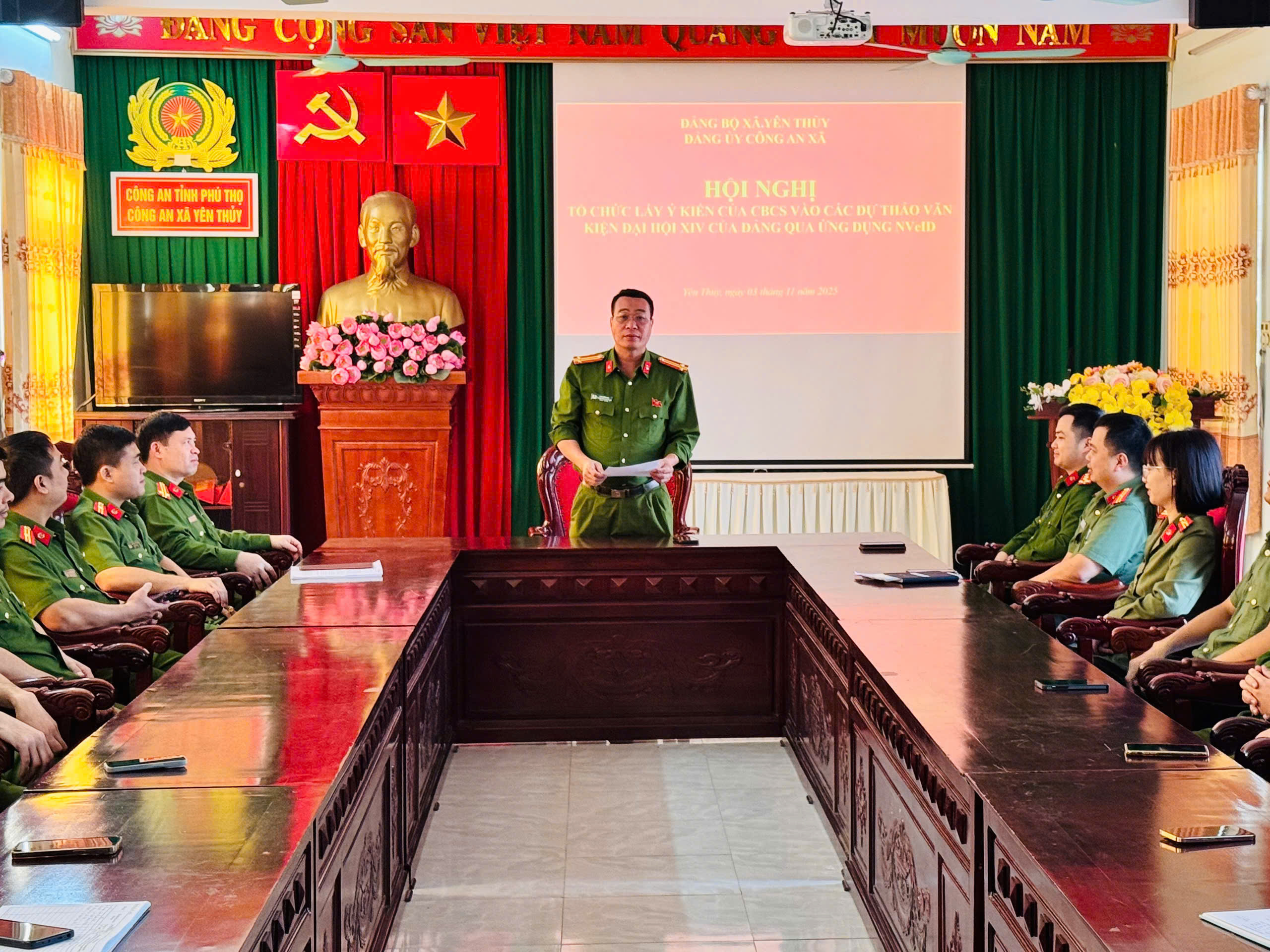 Thực hiện kế hoạch của Đảng ủy Công an tỉnh Phú Thọ và Đảng ủy xã Yên Thủy về việc lấy ý kiến đóng góp vào các dự thảo Văn kiện trình Đại hội XIV của Đảng, sáng ngày 03/11/2025, Đảng bộ Công an xã Yên Thủy tổ chức hội nghị lấy ý kiến cán bộ, đảng viên và chiến sĩ thông qua ứng dụng VNeID. Đây là hình thức được triển khai nhằm bảo đảm tính công khai, minh bạch và thuận tiện trong quá trình tổng hợp ý kiến.