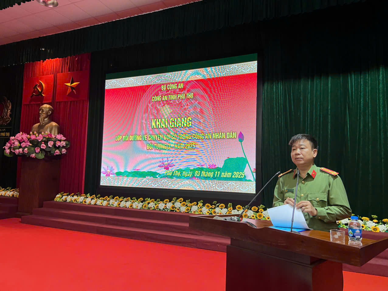 Sáng ngày 03/11/2025, Phòng Tổ chức cán bộ Công an tỉnh phối hợp với các đơn vị chức năng tổ chức khai giảng lớp bồi dưỡng về chuyển đổi số (lớp 01) cho 139 cán bộ chiến sĩ là Chỉ huy cấp đội và tương đương, thuộc đối tượng 3 năm 2025. Đây là hoạt động thiết thực nhằm nâng cao nhận thức, kỹ năng ứng dụng công nghệ thông tin, phục vụ hiệu quả công tác quản lý, chỉ huy trong lực lượng Công an tỉnh.