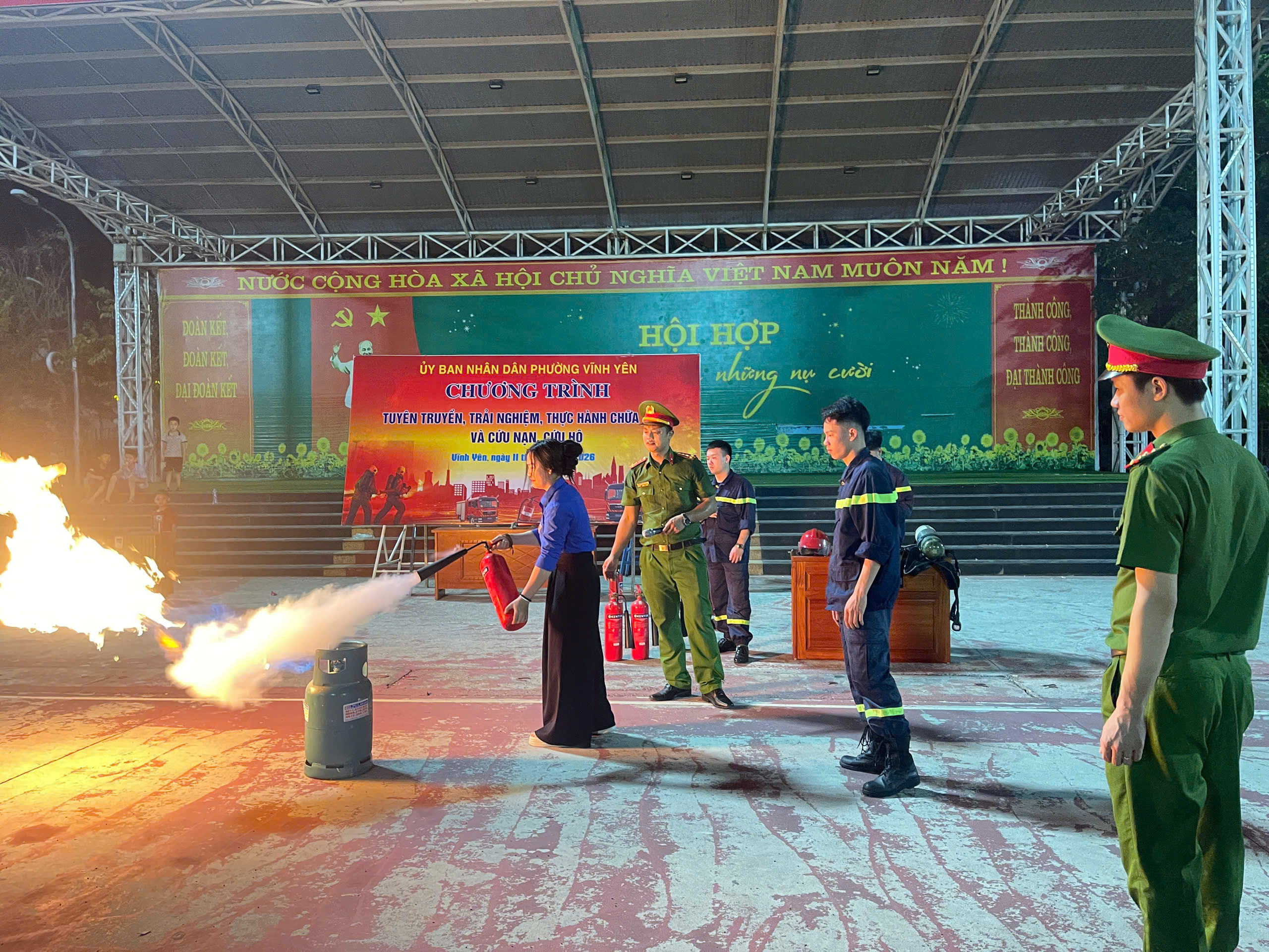 Nhằm nâng cao kiến thức, kỹ năng phòng cháy, chữa cháy và cứu nạn, cứu hộ cho người dân, Công an phường Vĩnh Yên đã tham mưu UBND phường tổ chức chương trình tuyên truyền, trải nghiệm và thực hành, góp phần chủ động phòng ngừa, xử lý các tình huống cháy, nổ trên địa bàn.