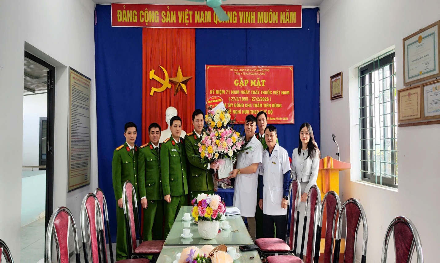 Nhân dịp kỷ niệm 71 năm Ngày Thầy thuốc Việt Nam (27/02/1955 – 27/02/2026), sáng ngày 27/2/2026, Công an xã Hoàng Cương đã tổ chức đoàn đến thăm, tặng hoa chúc mừng tập thể cán bộ, y bác sĩ Trạm Y tế xã Hoàng Cương và Trung tâm Y tế khu vực Thanh Ba.