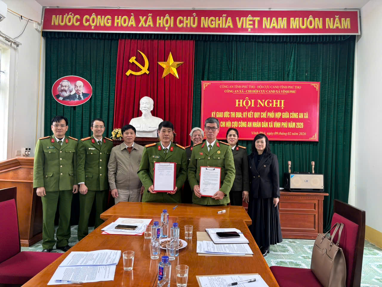 Nhằm tăng cường hiệu quả phối hợp trong công tác bảo đảm an ninh, trật tự ở cơ sở, chiều ngày 09/02/2026, Công an xã Vĩnh Phú tổ chức Hội nghị ký kết Giao ước thi đua và Quy chế phối hợp với Chi hội Cựu Công an nhân dân xã Vĩnh Phú năm 2026.