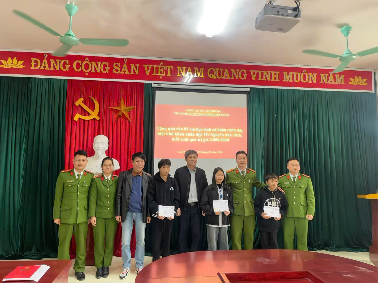 Ngày 09/02/2026, Đoàn công tác của Công an xã Cao Dương đã đến thăm và trao quà cho các em học sinh có hoàn cảnh khó khăn nhưng đạt thành tích tốt, nỗ lực vươn lên trong học tập tại Trường Trung học Phổ thông Cù Chính Lan.