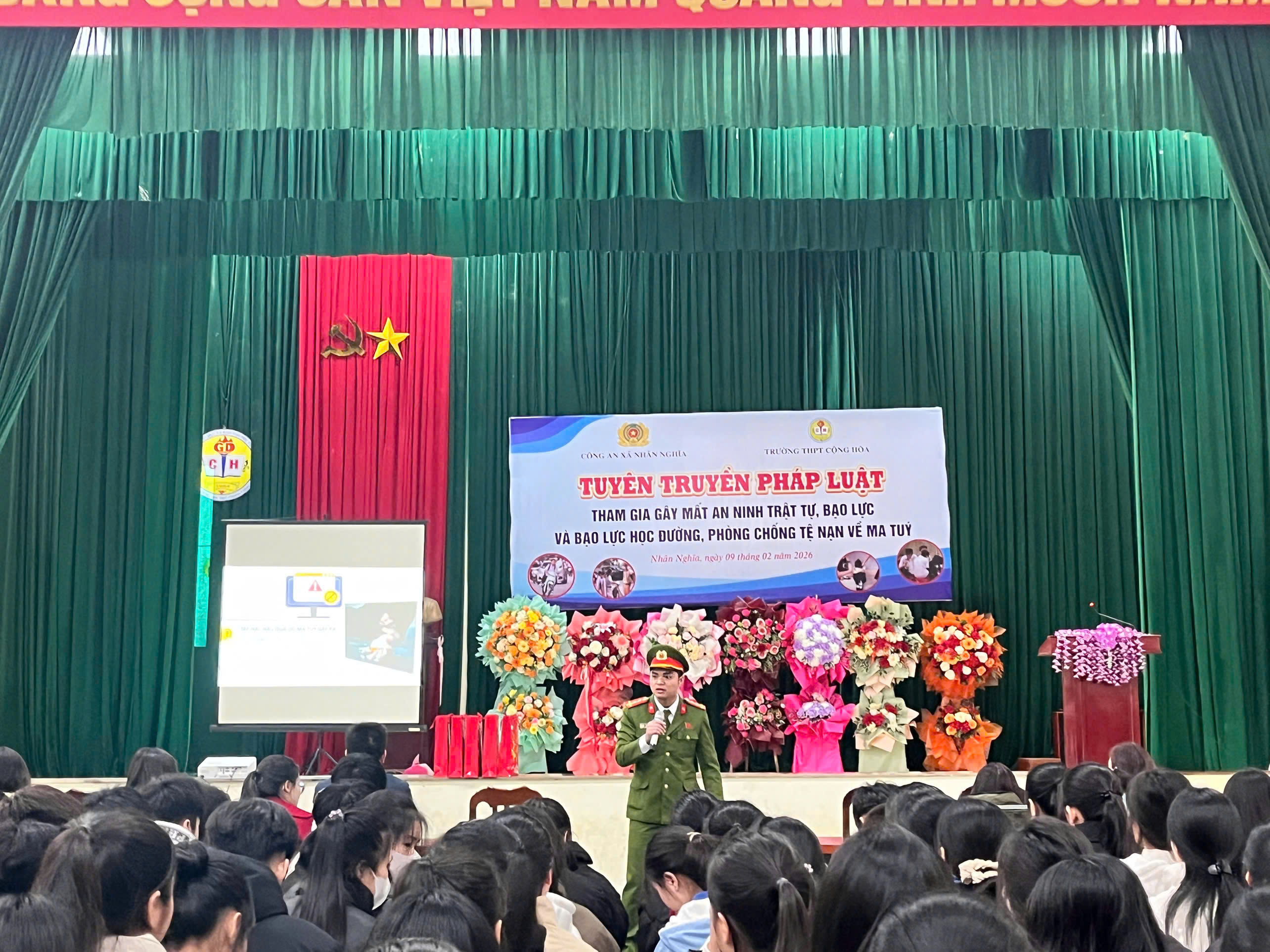 Ngày 09/02/2026, Công an xã Nhân Nghĩa phối hợp với Trường THPT Cộng Hòa tổ chức buổi tuyên truyền pháp luật cho cán bộ, giáo viên và học sinh toàn trường về phòng, chống vi phạm pháp luật, bạo lực học đường và tệ nạn ma túy, góp phần xây dựng môi trường giáo dục an toàn, lành mạnh.