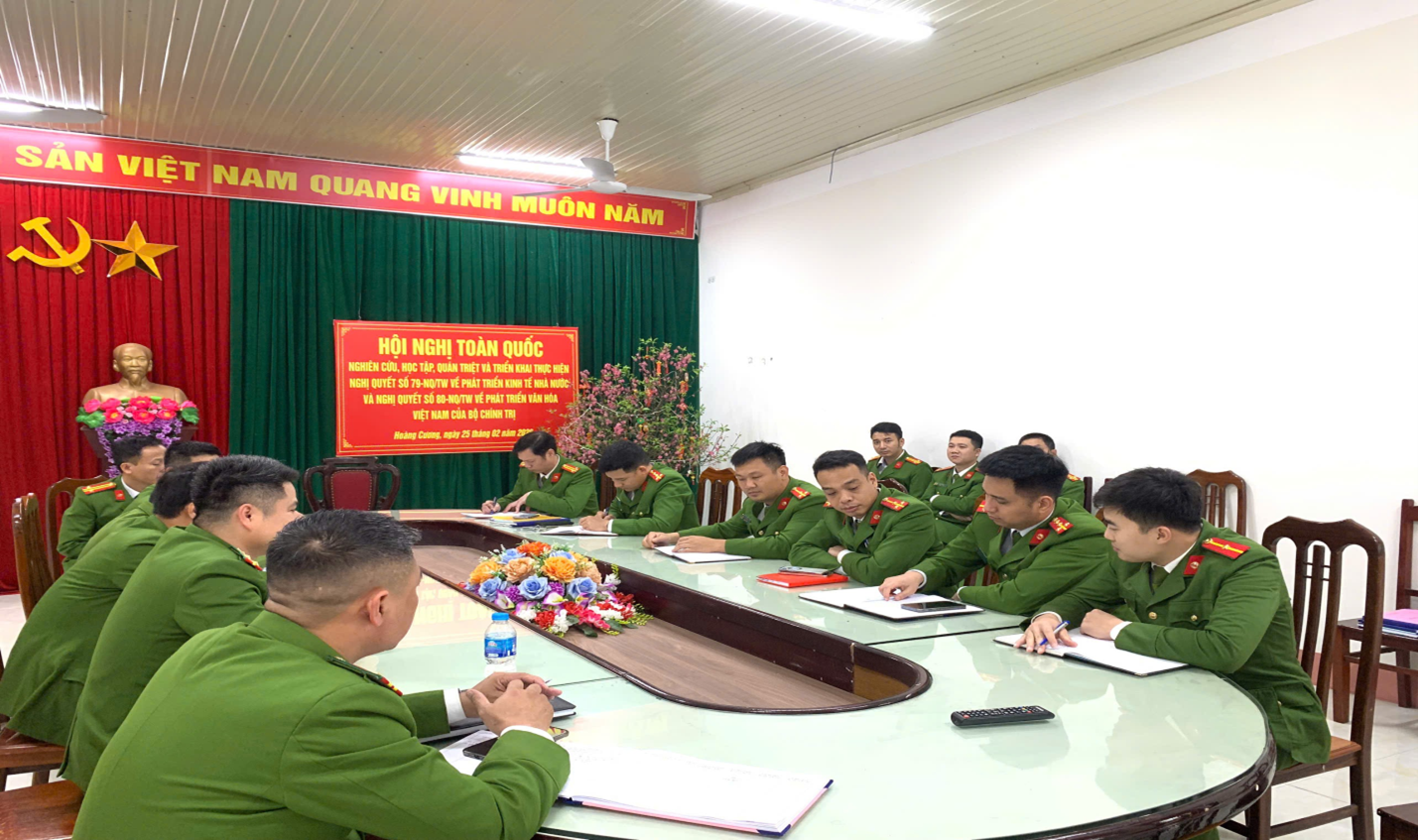 Ngày 25/02/2026, Công an xã Hoàng Cương tổ chức hội nghị nghiên cứu, học tập, quán triệt và triển khai thực hiện Nghị quyết số 79-NQ/TW về phát triển kinh tế nhà nước và Nghị quyết số 80-NQ/TW về phát triển văn hóa Việt Nam của Bộ Chính trị. Hội nghị được tổ chức theo đúng kế hoạch, bảo đảm nội dung, chương trình đề ra, với sự tham gia đầy đủ của cán bộ, chiến sĩ trong đơn vị.