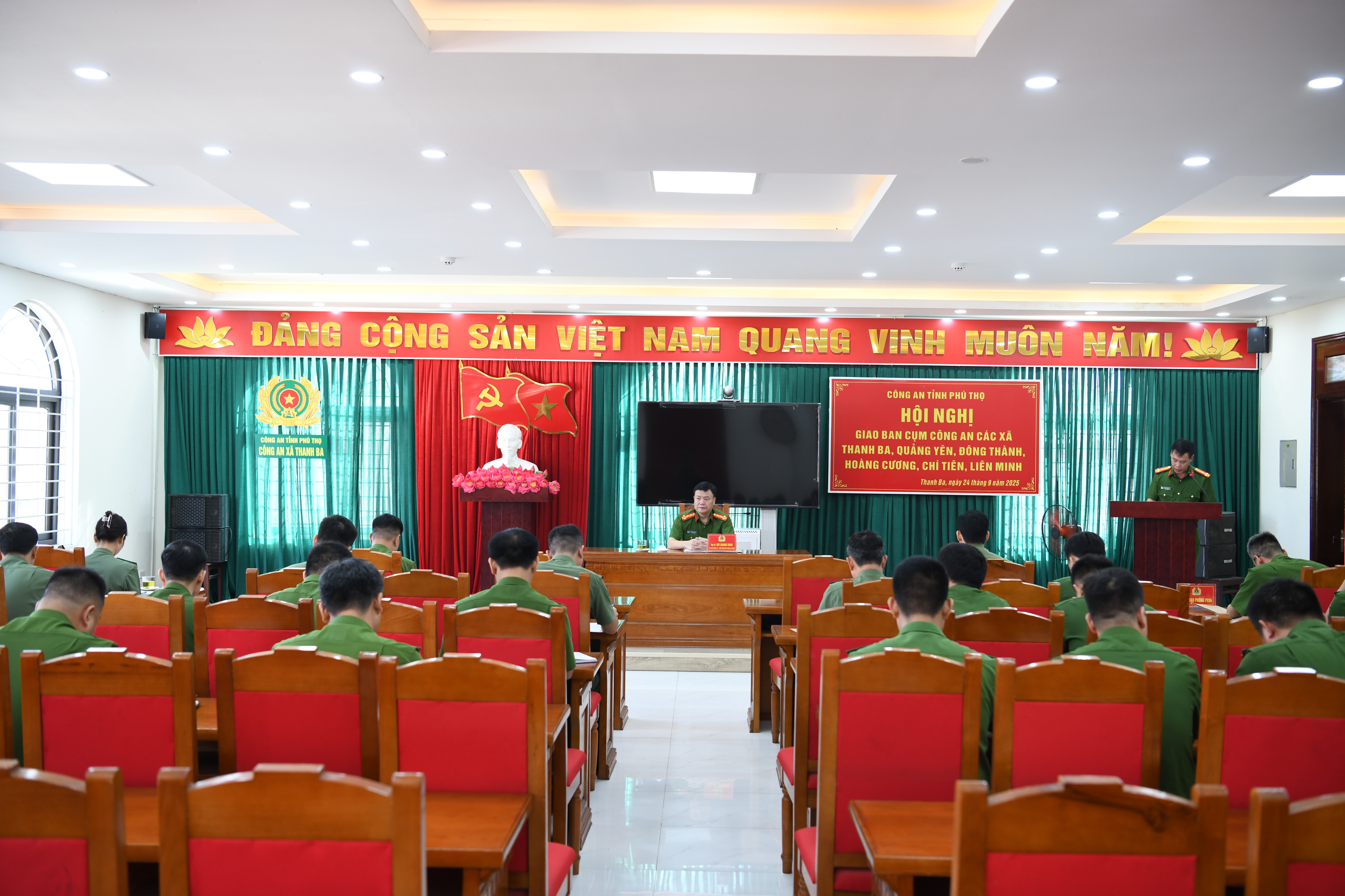 Sáng 24/9, Công an tỉnh Phú Thọ tổ chức Hội nghị giao ban tháng 9 với cụm Công an 6 xã: Thanh Ba, Quảng Yên, Đông Thành, Hoàng Cương, Chí Tiên và Liên Minh. Đồng chí Đại tá Bùi Quang Khoa, Phó Giám đốc Công an tỉnh dự và chủ trì hội nghị. Tham dự còn có đại diện lãnh đạo các phòng nghiệp vụ cùng chỉ huy Công an các xã trong cụm.