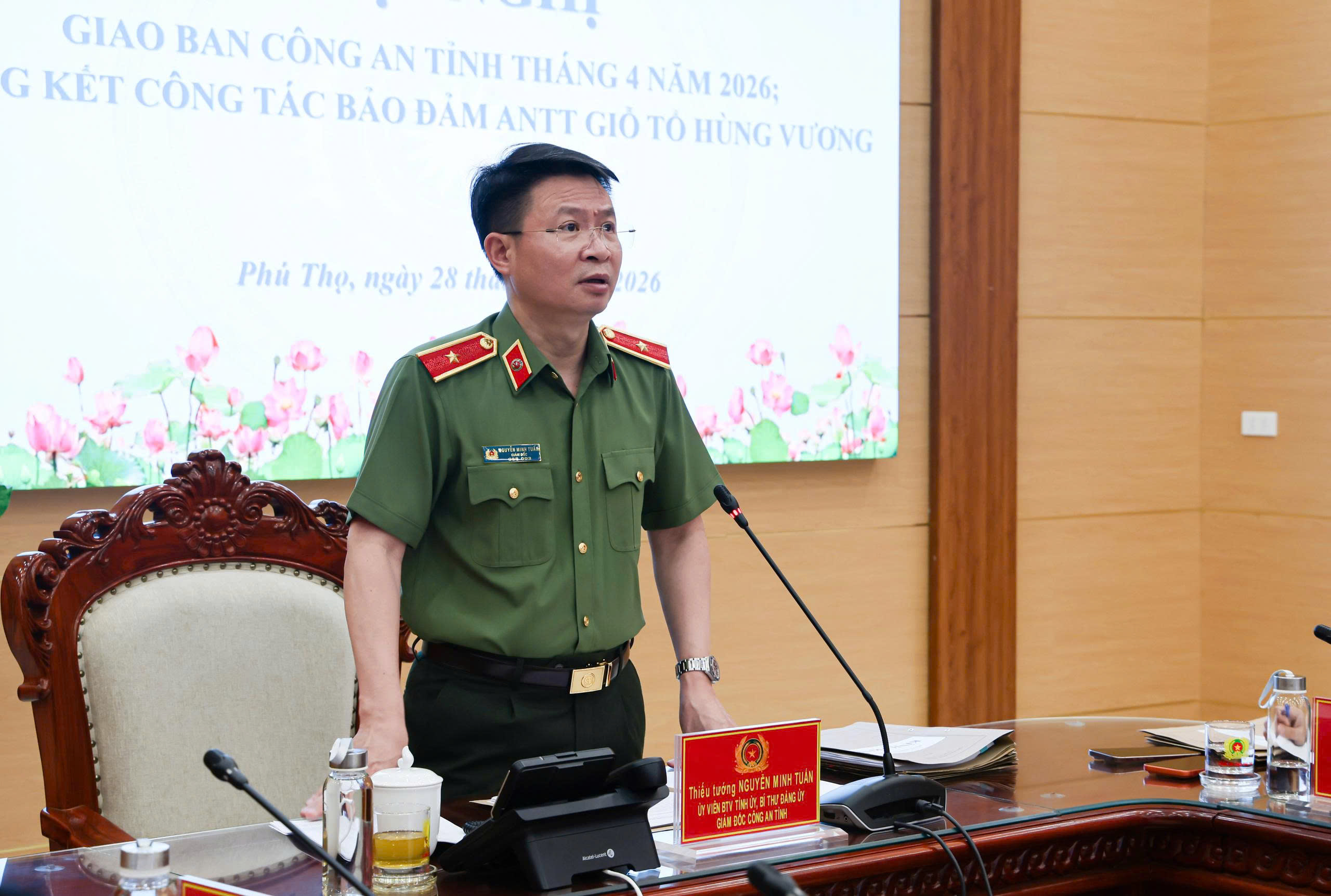 Ngày 28/4/2026, Công an tỉnh tổ chức hội nghị trực tuyến sơ kết, đánh giá tình hình, kết quả công tác tháng 4; tổng kết công tác bảo đảm an ninh trật tự dịp Giỗ Tổ Hùng Vương và triển khai nhiệm vụ công tác tháng 5. Thiếu tướng Nguyễn Minh Tuấn, Ủy viên BTV Tỉnh ủy, Giám đốc Công an tỉnh chủ trì hội nghị. Cùng dự hội nghị tại điểm cầu Công an tỉnh có các đồng chí trong Ban Giám đốc Công an tỉnh, Trưởng các đơn vị, đại diện Ban Thanh niên, Ban Phụ nữ Công an tỉnh. Tại các điểm cầu Công an xã, phường, đồn có chỉ huy, cán bộ, chiến sĩ Công an xã, phường, đồn tham dự.