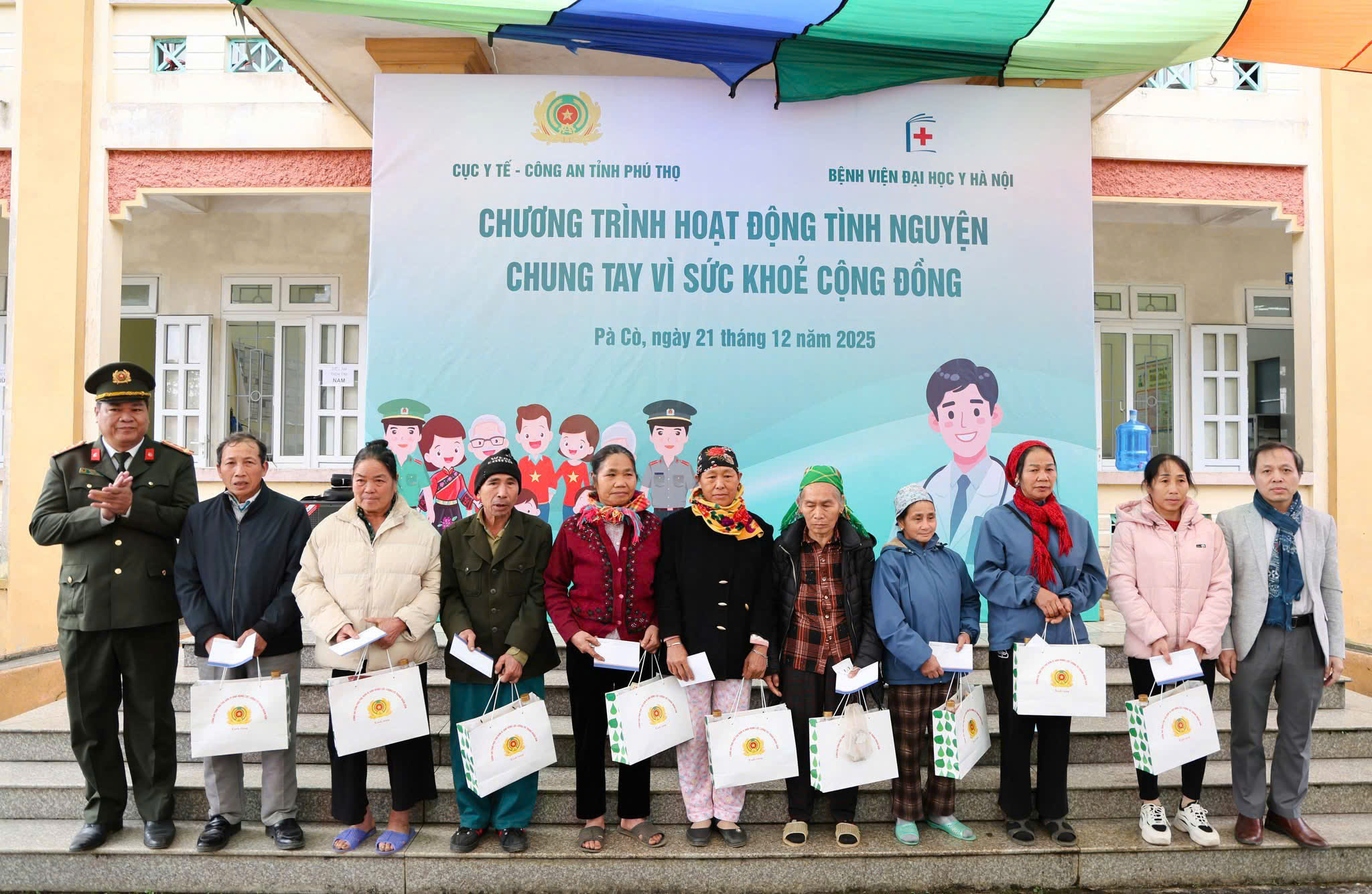 Sáng ngày 21/12/2025, Công an tỉnh Phú Thọ phối hợp với Cục Y tế – Bộ Công an, Bệnh viện Đại học Y Hà Nội, Bệnh viện Y học cổ truyền – Bộ Công an, Bệnh viện Đa khoa tỉnh Phú Thọ và Bệnh viện Công an tỉnh Phú Thọ tổ chức chương trình khám bệnh, tư vấn sức khỏe, cấp phát thuốc miễn phí và tặng quà cho Nhân dân xã Pà Cò. Tham dự chương trình có đồng chí Đại tá Nguyễn Thành, Phó Giám đốc Công an tỉnh Phú Thọ; cùng dự có đồng chí Đại tá Mai Thị Kim Thanh, Phó Cục trưởng Cục Y tế – Bộ Công an, đại diện lãnh đạo các đơn vị y tế, cấp ủy, chính quyền địa phương và đông đảo bà con Nhân dân.
