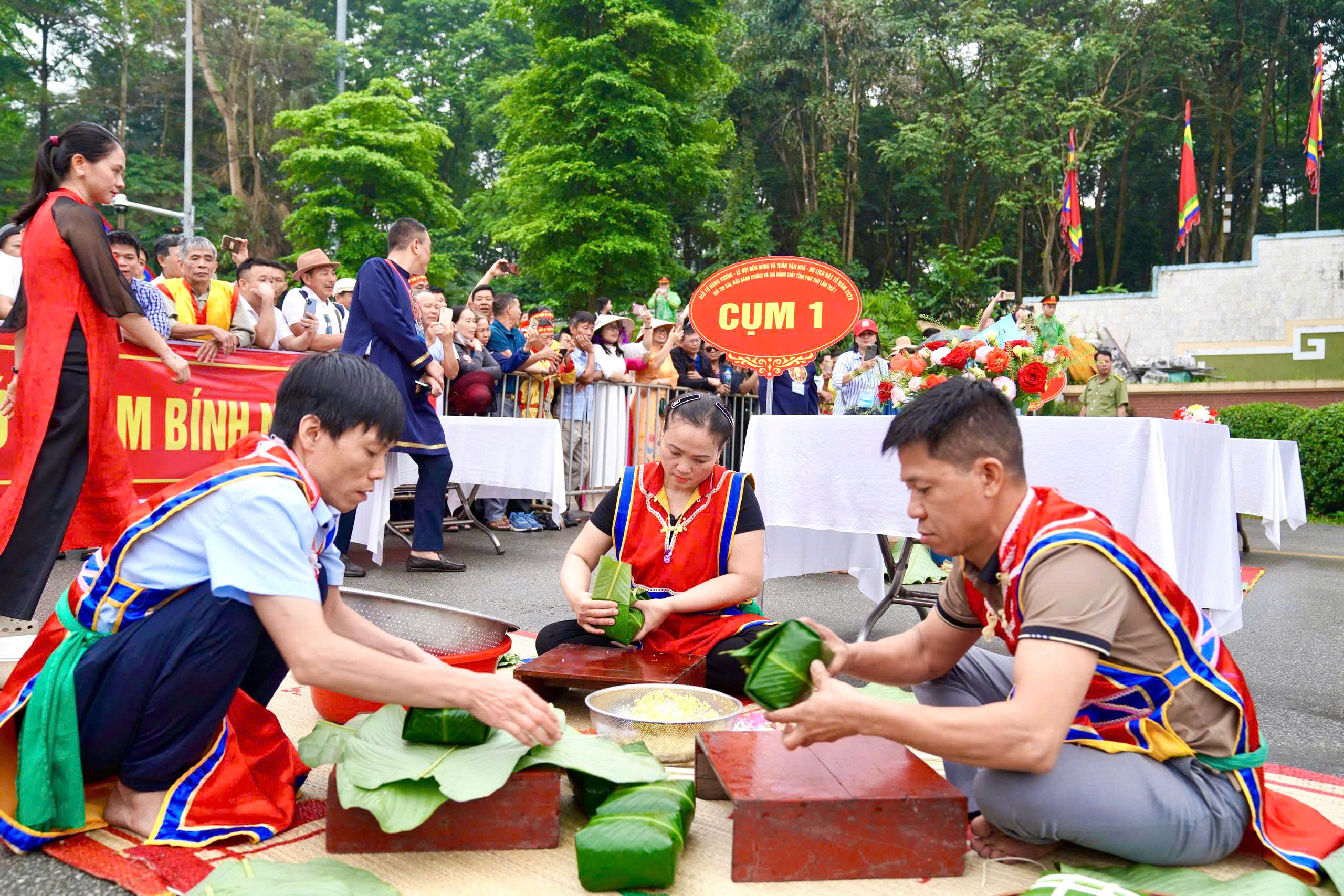 Ngày 24/4, tại sân Trung tâm lễ hội, Khu Di tích lịch sử Đền Hùng, Hội thi gói, nấu bánh chưng, giã bánh giầy dâng Vua Hùng năm 2026 diễn ra sôi nổi, thu hút đông đảo Nhân dân và du khách thập phương về dự, cổ vũ.