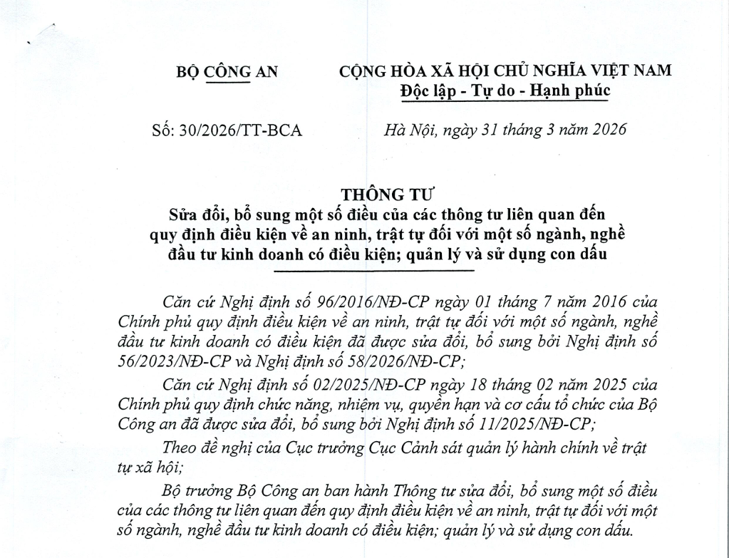 Nhằm tiếp tục cải cách thủ tục hành chính, tạo điều kiện thuận lợi cho các cơ sở kinh doanh hoạt động đúng quy định, ngày 31/3/2026, Bộ Công an đã ban hành Thông tư số 30/2026/TT-BCA sửa đổi, bổ sung một số điều của các thông tư liên quan đến quy định điều kiện về an ninh, trật tự (ANTT) đối với một số ngành, nghề đầu tư kinh doanh có điều kiện; quản lý và sử dụng con dấu.