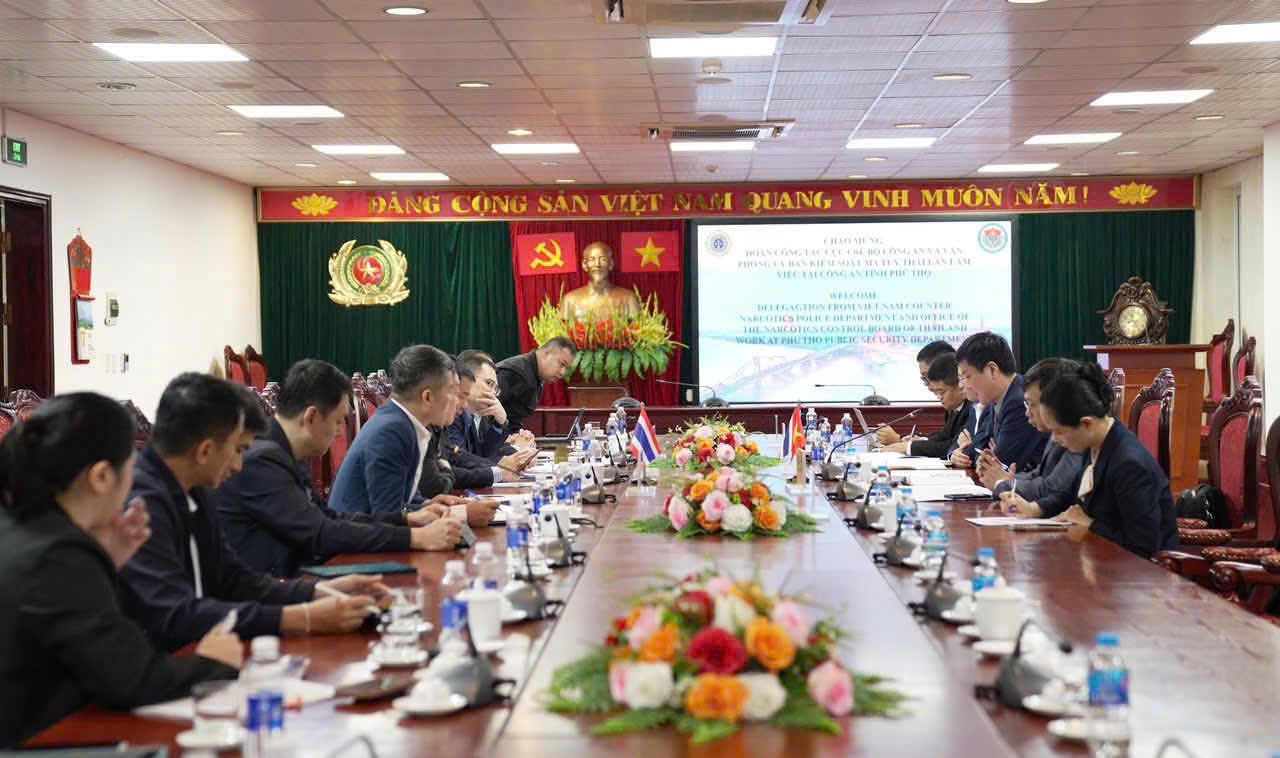 Ngày 17/12/2025, Đoàn đại biểu Ủy ban Kiểm soát ma túy Thái Lan do Ngài Apikit Ch. Rojprasert, Phó Tổng Thư ký Văn phòng Ủy ban Kiểm soát ma túy Thái Lan làm Trưởng đoàn đã đến thăm, làm việc tại Công an tỉnh Phú Thọ. Tiếp và làm việc với Đoàn có Đại tá Trương Quang Hải, Phó Giám đốc Công an tỉnh Phú Thọ. Cùng dự có Đại tá Hoàng Quốc Việt, Phó Cục trưởng Cục Cảnh sát điều tra tội phạm về ma túy - Bộ Công an và đại diện các phòng nghiệp vụ Công an tỉnh.