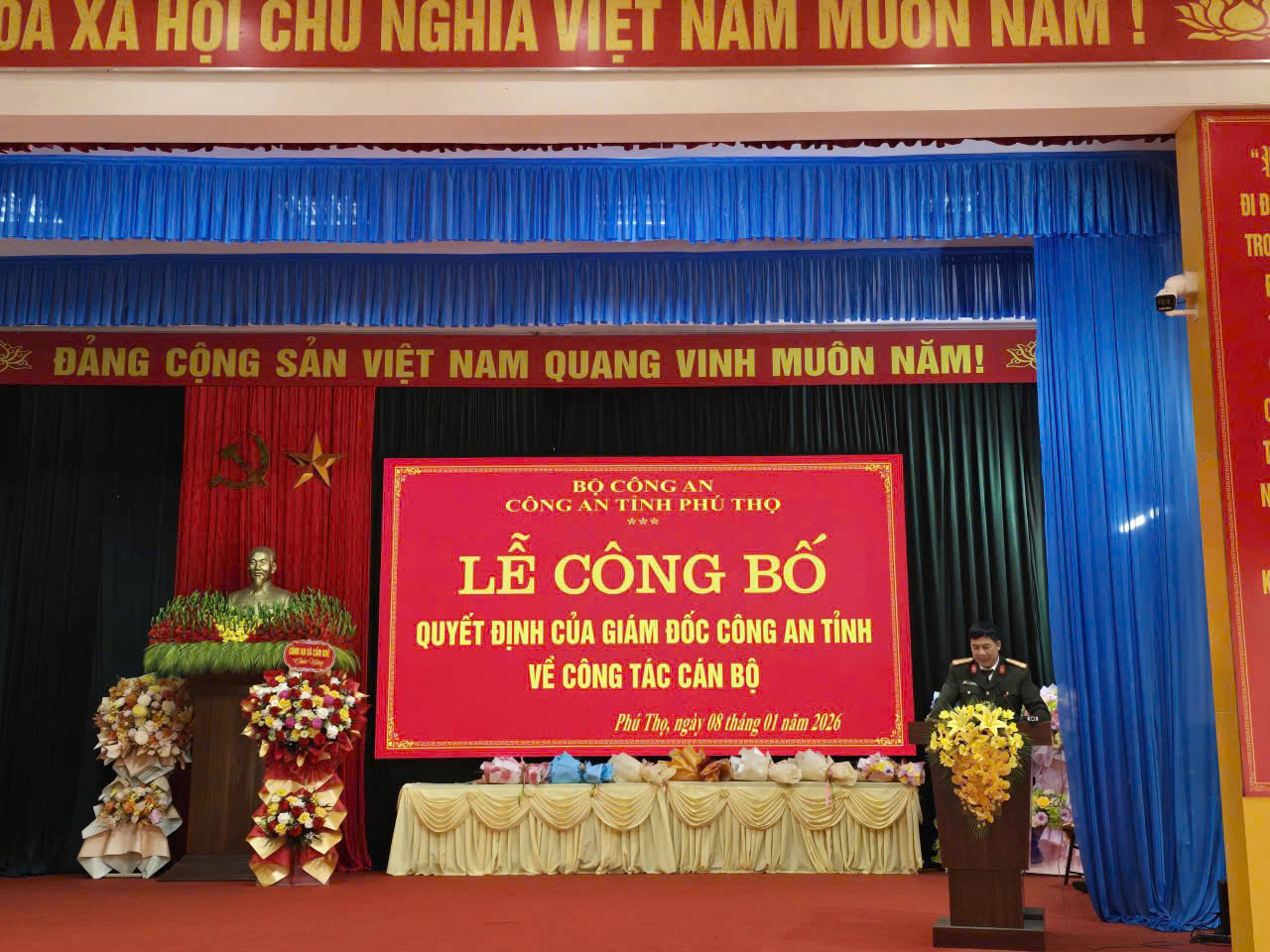 Chiều ngày 08/01/2026, Công an tỉnh Phú Thọ tổ chức Lễ công bố các quyết định của Giám đốc Công an tỉnh về công tác cán bộ tại Công an xã Tiên Lương và Công an xã Minh Hòa. Buổi lễ được tổ chức trang trọng, bảo đảm đúng quy định, thể hiện sự quan tâm của Đảng ủy, Ban Giám đốc Công an tỉnh đối với công tác xây dựng lực lượng Công an cơ sở.
