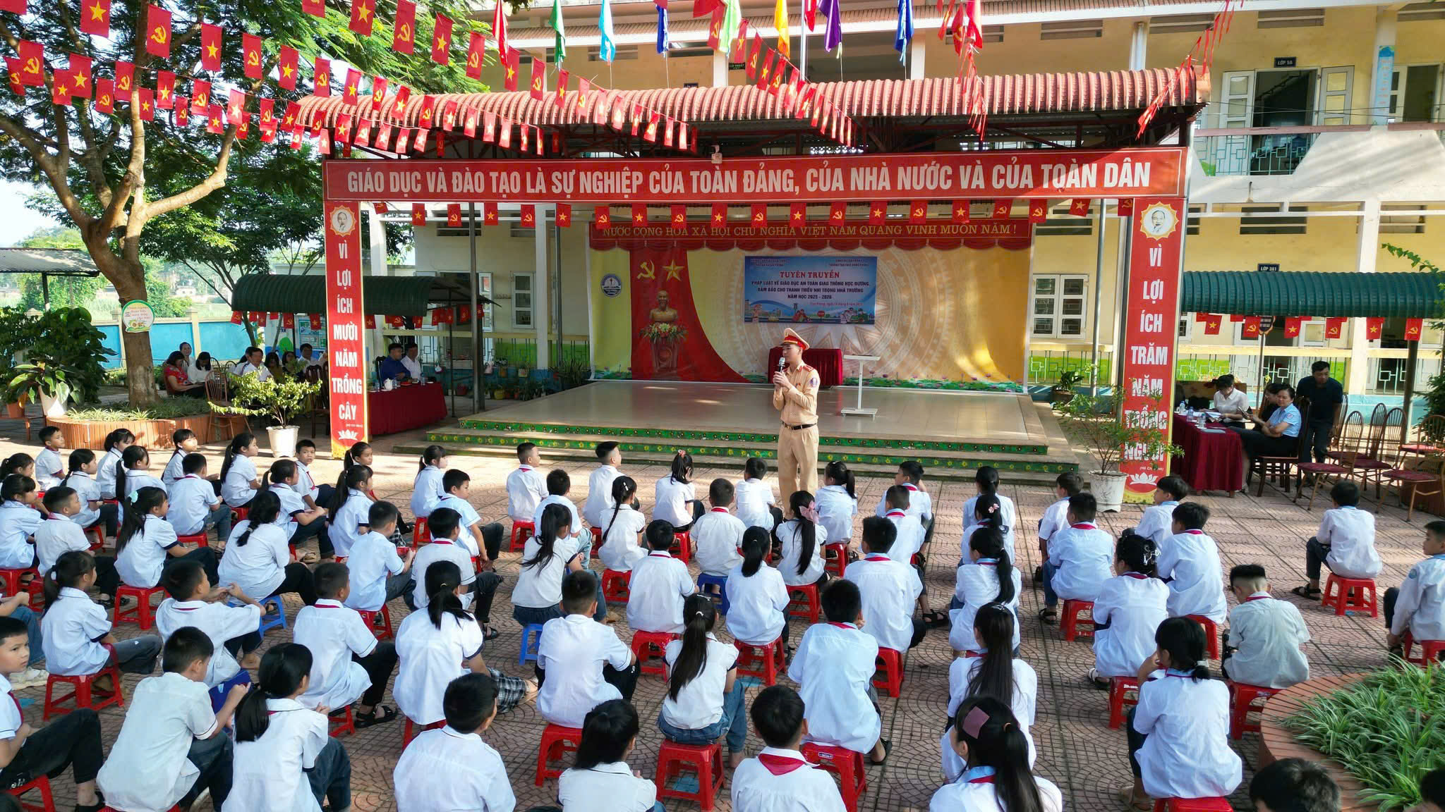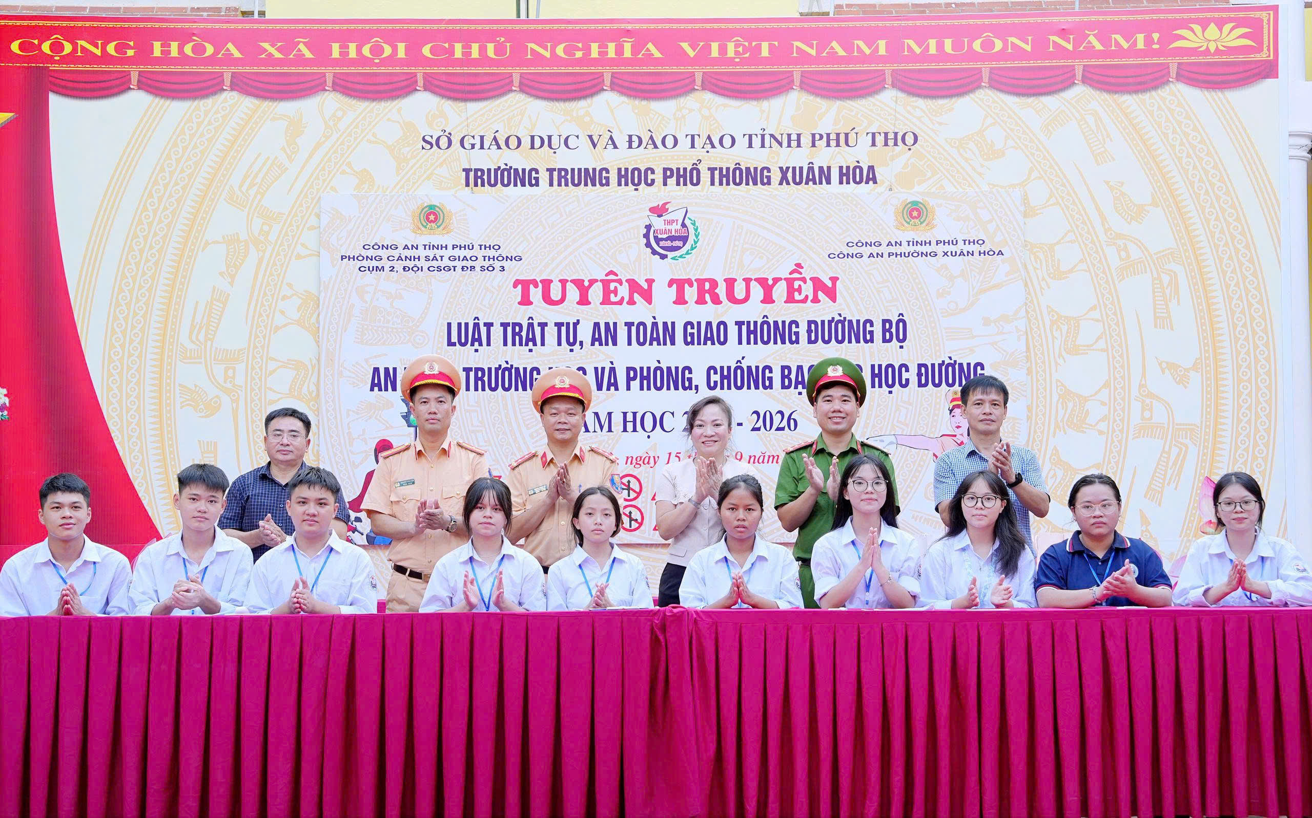 Ngày 15/9/2025, Công an phường Xuân Hòa, tỉnh Phú Thọ phối hợp với Phòng Cảnh sát giao thông Công an tỉnh tổ chức chương trình tuyên truyền pháp luật về trật tự an toàn giao thông và phòng, chống bạo lực học đường cho hơn 1.200 học sinh Trường THPT Xuân Hòa.