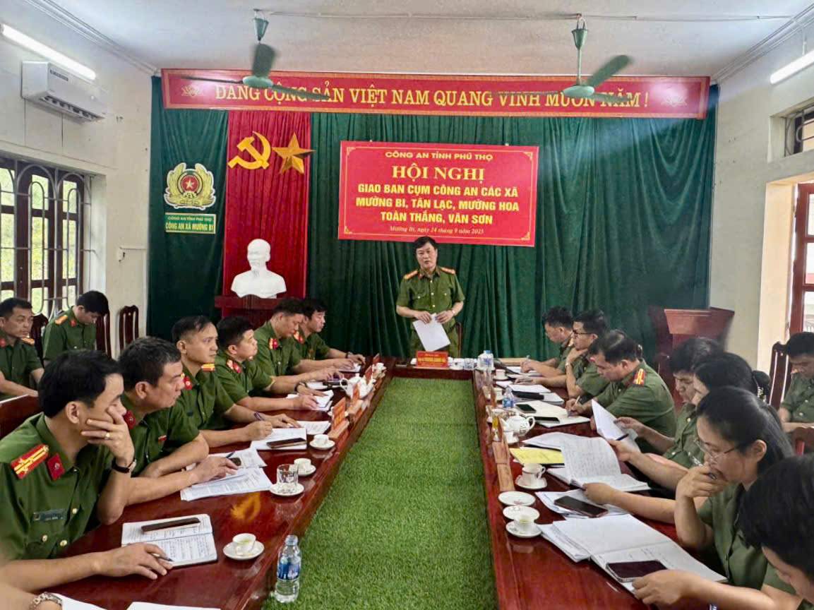 Sáng 24/9/2025, tại trụ sở Công an xã Mường Bi, Công an tỉnh Phú Thọ tổ chức hội nghị giao ban cụm Công an các xã: Mường Bi, Tân Lạc, Toàn Thắng, Mường Hoa và Vân Sơn. Đại tá Trương Quang Hải – Phó Giám đốc Công an tỉnh chủ trì hội nghị. Tham dự có lãnh đạo các phòng nghiệp vụ Công an tỉnh và Ban Chỉ huy Công an 5 xã trong cụm.