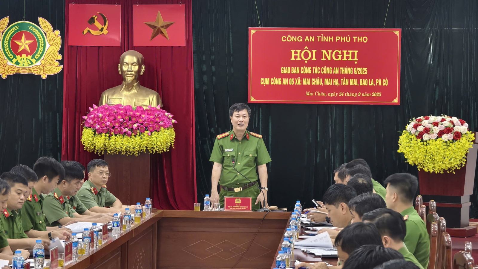 Chiều ngày 24/9/2025, tại Công an xã Mai Châu, đồng chí Đại tá Trương Quang Hải, Phó Giám đốc Công an tỉnh Phú Thọ đã có buổi giao ban với Công an các xã Mai Châu, Bao La, Mai Hạ, Pà Cò và Tân Mai. Tham dự buổi làm việc còn có đại diện lãnh đạo một số phòng chức năng thuộc Công an tỉnh.