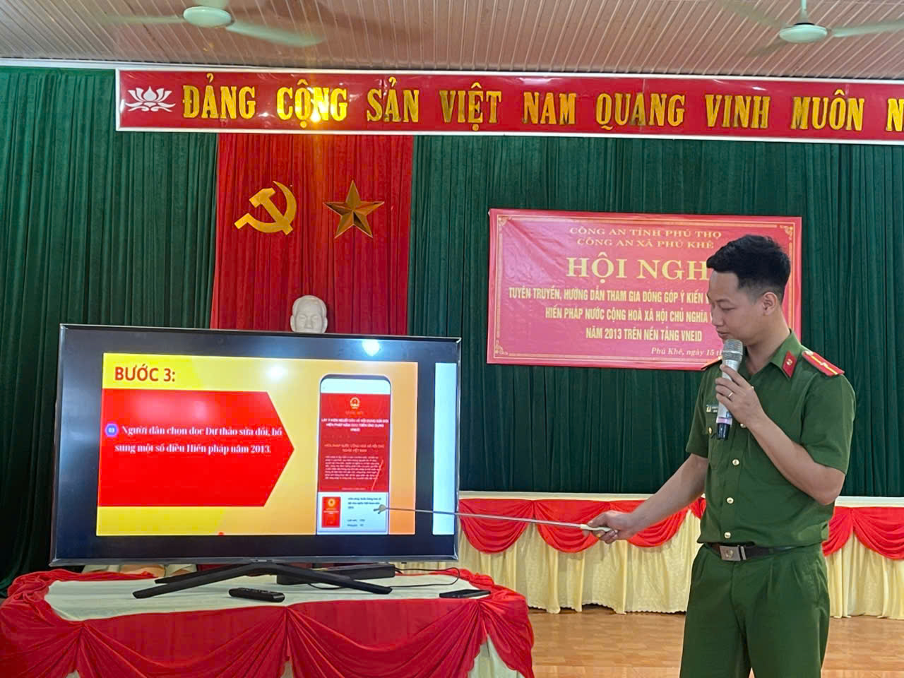 Ngày 15/5/2025, Công an xã Phú Khê phối hợp với Đảng ủy, UBND xã tổ chức Hội nghị tuyên truyền, hướng dẫn tham gia ý kiến vào dự thảo sửa đổi, bổ sung Hiến pháp năm 2013 qua ứng dụng VNeID. Tham dự hội nghị có các đồng chí trong Ban Chấp hành Đảng ủy, Bí thư các chi bộ và toàn thể cán bộ, công chức, viên chức, người lao động thuộc UBND xã.
