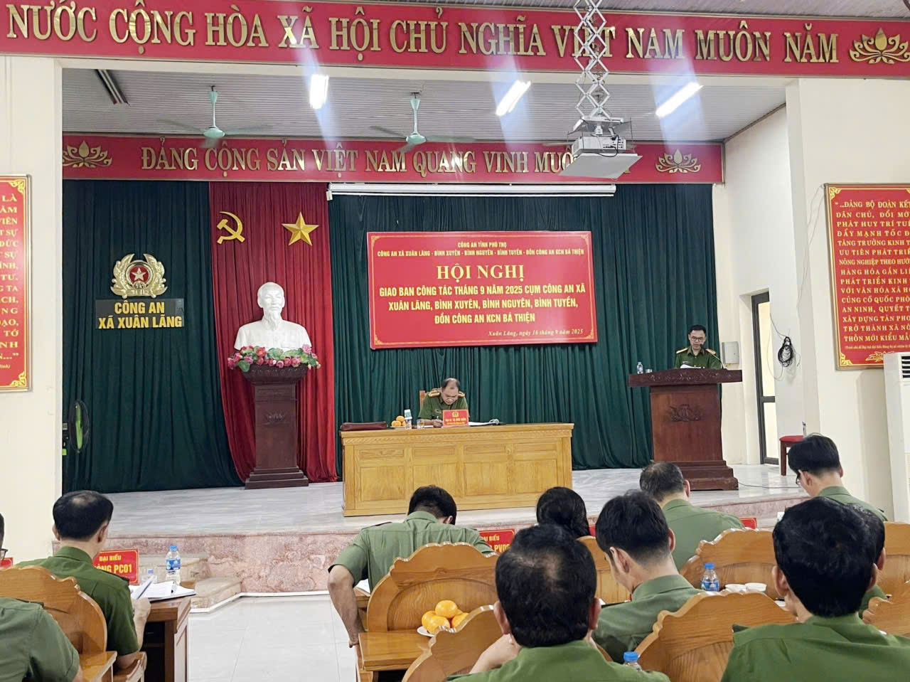 Chiều 16/9/2025, tại trụ sở Công an xã Xuân Lãng, Công an tỉnh Phú Thọ tổ chức Hội nghị giao ban cụm Công an cấp xã tháng 9/2025 gồm các đơn vị: Xuân Lãng, Bình Nguyên, Bình Xuyên, Bình Tuyền và Đồn Công an Khu công nghiệp Bá Thiện. Đại tá Tạ Đức Diễn – Phó Giám đốc Công an tỉnh chủ trì hội nghị.