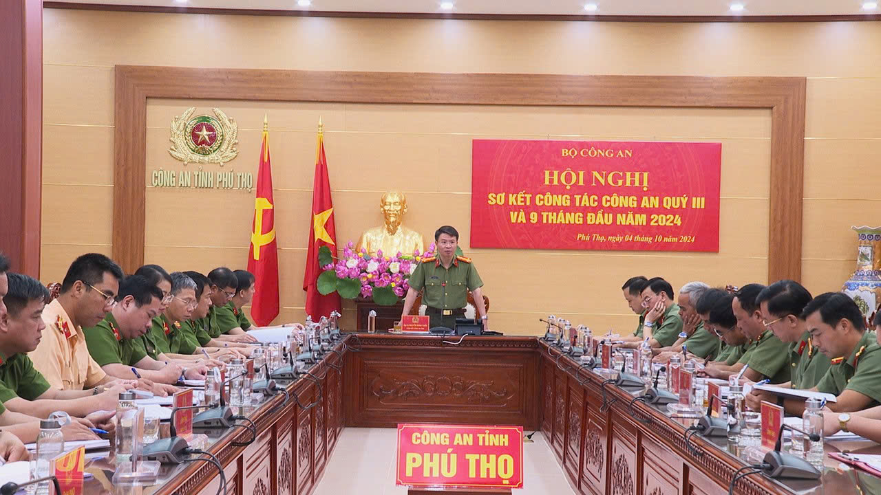 Ngày 04/10, tại Hà Nội, Bộ Công an tổ chức Hội nghị sơ kết công tác công an Quý III và 9 tháng đầu năm 2024. Thượng tướng Lương Tam Quang, Ủy viên Bộ Chính trị, Bí thư Đảng ủy Công an Trung ương, Bộ trưởng Bộ Công an chủ trì Hội nghị. Hội nghị tổ chức theo hình thức trực tiếp kết hợp trực tuyến đến Công an các địa phương. Tại điểm cầu Công an tỉnh Phú Thọ, đồng chí Đại tá Nguyễn Minh Tuấn, Uỷ viên BTV Tỉnh uỷ, Bí thư Đảng uỷ, Giám đốc Công an tỉnh chủ trì hội nghị.
