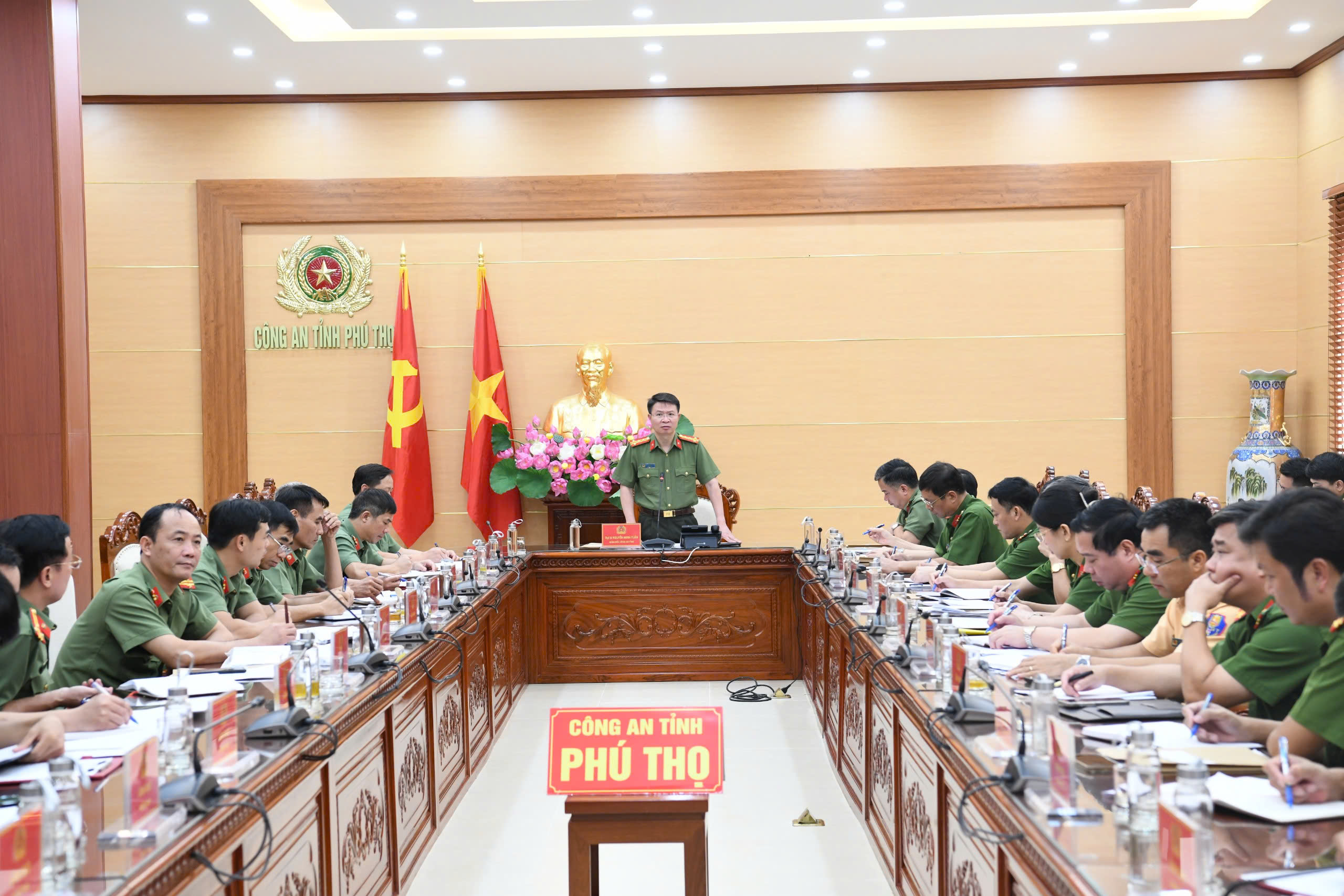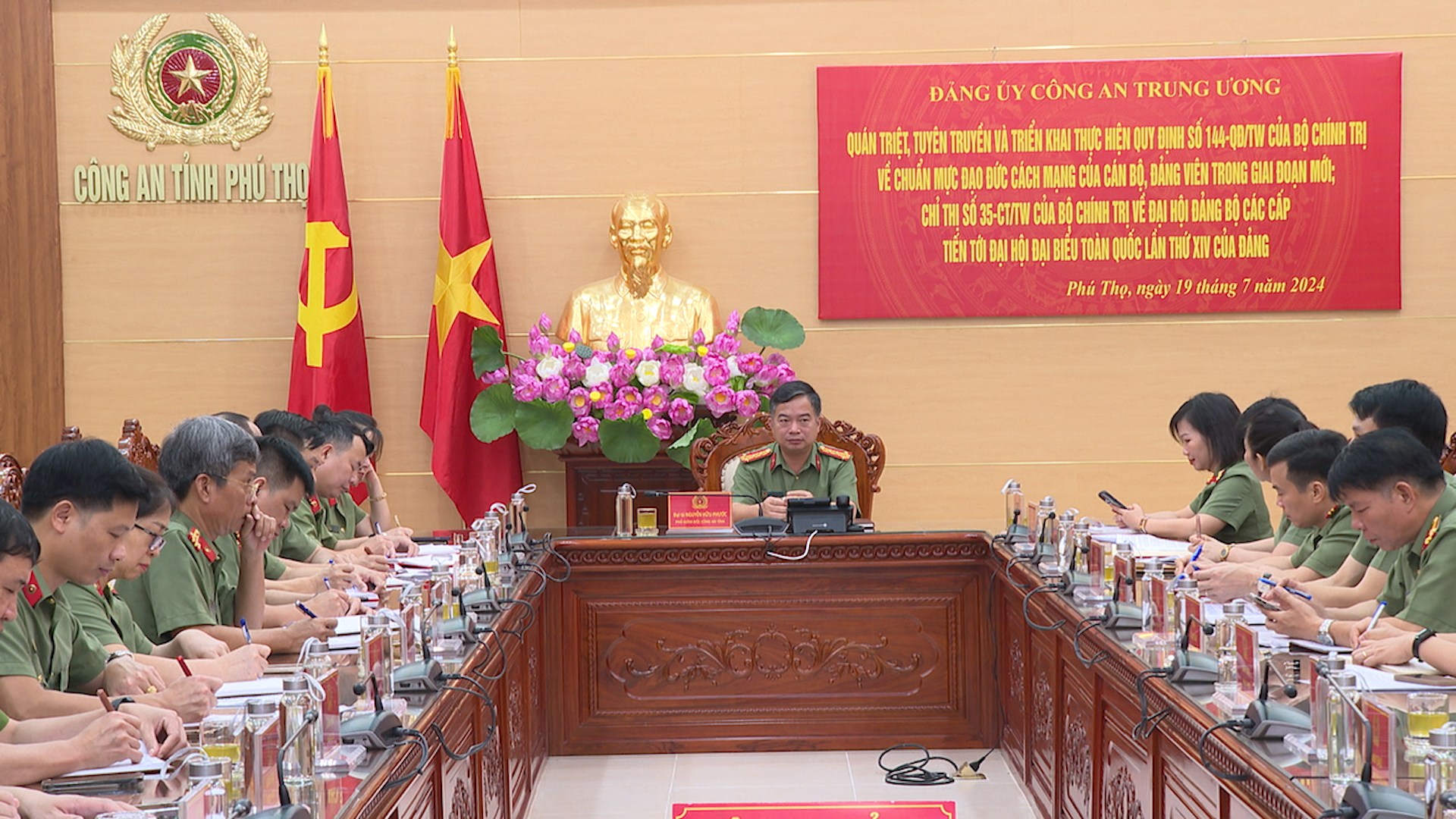 Ngày 19/7/2024, Đảng uỷ Công an Trung ương tổ chức Hội nghị Quán triệt, triển khai thực hiện Quy định số 144-QĐ/TW ngày 09/5/2024 của Bộ Chính trị về chuẩn mực đạo đức cách mạng của cán bộ, đảng viên trong giai đoạn mới (Quy định số 144); Chỉ thị số 35 – CT/TW ngày 14/6/2024 của Bộ Chính trị về Đại hội Đảng bộ các cấp tiến tới Đại hội đại biểu toàn quốc lần thứ XIV của Đảng (Chỉ thị số 35). Thượng tướng Trần Quốc Tỏ, Uỷ viên Trung ương Đảng, Phó Bí thư Đảng uỷ Công an Trung ương, Thứ trưởng Bộ Công an chủ trì Hội nghị. Tại điểm cầu Công an tỉnh Phú Thọ, đồng chí Đại tá Nguyễn Hữu Phước, Phó Bí thư Đảng uỷ, Phó Giám đốc Công an tỉnh chủ trì hội nghị.