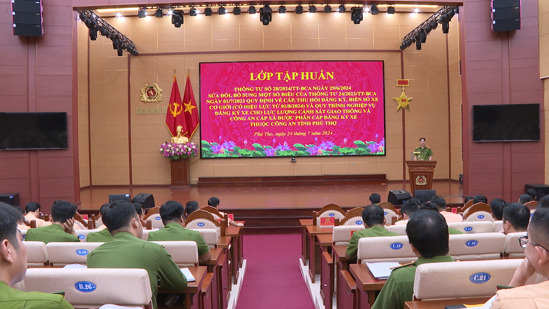 Ngày 24/7, Công an tỉnh tổ chức Hội nghị tập huấn Thông tư số 28/2024/TT -BCA ngày 29/6/2024 sửa đổi bổ sung một số điều của Thông tư 24/2023/TT-BCA ngày 01/7/2023 của Bộ Công an về cấp, thu hồi đăng ký, biển số xe cơ giới và quy trình nghiệp vụ đăng ký xe cho lực lượng Cảnh sát giao thông và cán bộ Công an cấp xã được phân cấp đăng ký xe trên địa bàn tỉnh. Đồng chí Thượng tá Nguyễn Xuân Trung – Phó Giám đốc Công an tỉnh phát biểu chỉ đạo.