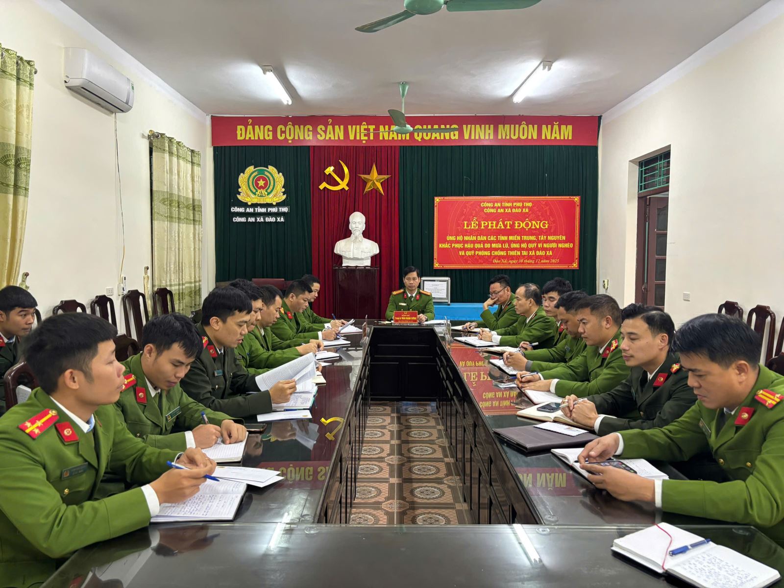 Hưởng ứng lời kêu gọi của các cấp, các ngành về việc chung tay chia sẻ khó khăn với nhân dân các tỉnh miền Trung và Tây Nguyên bị ảnh hưởng bởi mưa lũ, sáng 30/12/2025, Công an xã Đào Xá đã tổ chức lễ phát động ủng hộ nhằm kêu gọi cán bộ, chiến sĩ trong đơn vị tham gia đóng góp, hỗ trợ đồng bào vùng thiên tai.