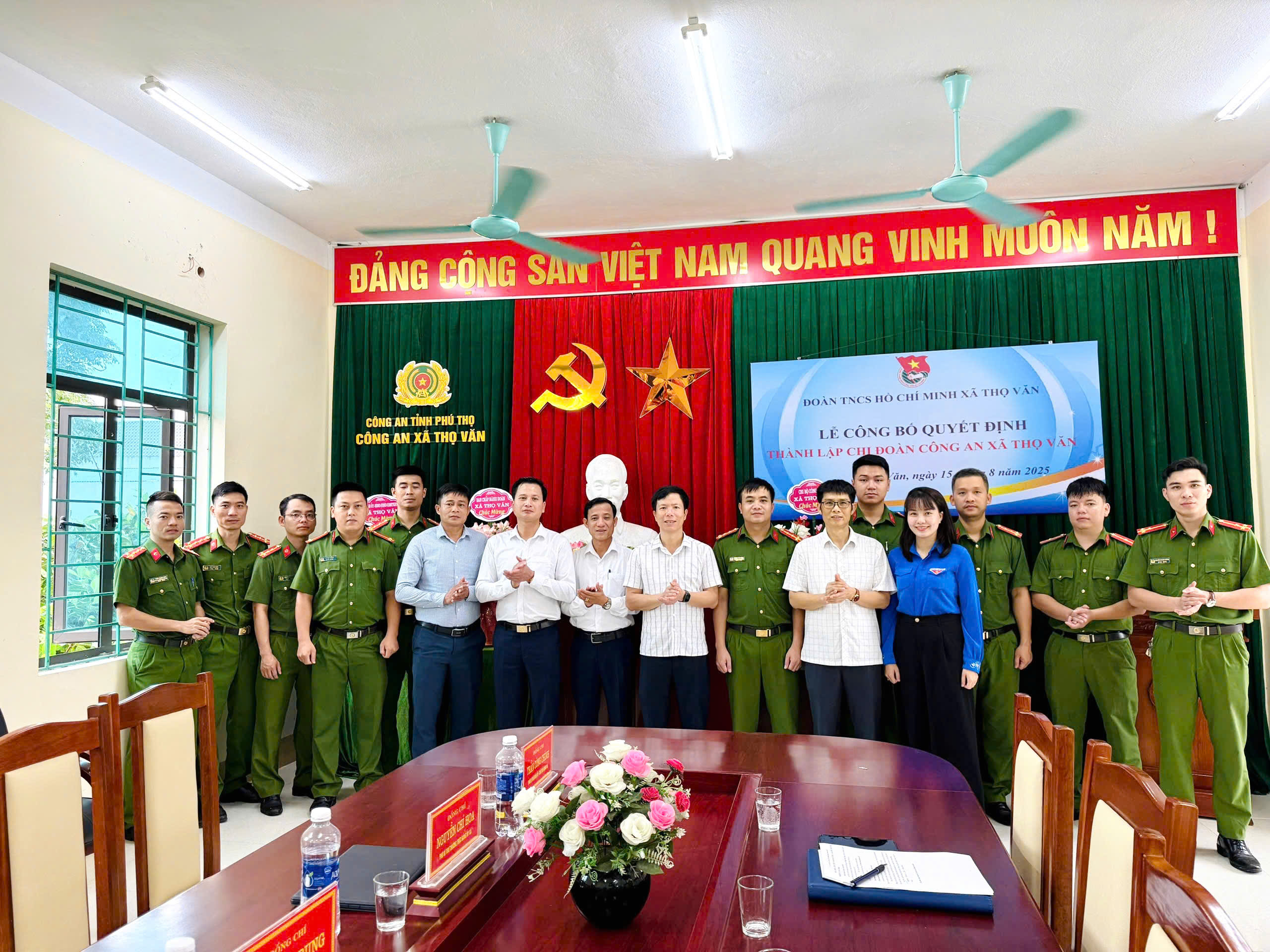 Sáng ngày 15/8/2025, tại trụ sở Công an xã Thọ Văn đã diễn ra lễ công bố quyết định thành lập Chi đoàn Công an xã Thọ Văn, một sự kiện quan trọng đánh dấu bước phát triển mới trong công tác đoàn và phong trào thanh niên tại địa phương. Buổi lễ do Đoàn Thanh niên Cộng sản Hồ Chí Minh xã Thọ Văn phối hợp với lực lượng Công an xã tổ chức, với sự tham dự của các đồng chí lãnh đạo địa phương bao gồm: Đồng chí Trần Công Chính - Phó Bí thư Đảng ủy, Chủ tịch UBND xã, Đồng chí Nguyễn Chí Hoa - Phó Bí thư Thường trực Đảng ủy, đại diện các ban, ngành, đoàn thể, cùng đông đảo cán bộ, chiến sĩ Công an xã Thọ Văn.