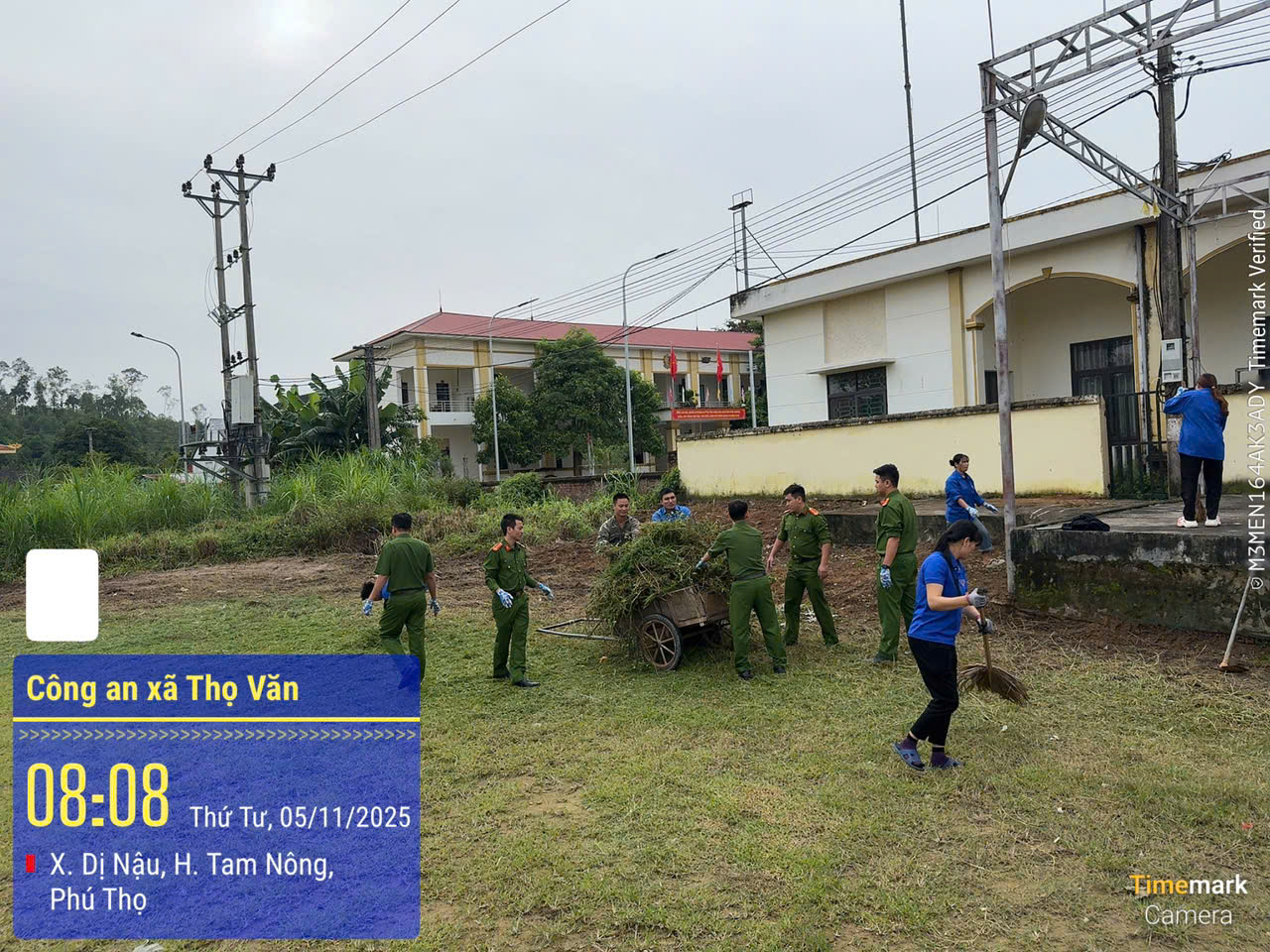 Hưởng ứng các hoạt động thiết thực chào mừng thành công Đại hội Đại biểu Đoàn TNCS Hồ Chí Minh xã Thọ Văn lần thứ I, nhiệm kỳ 2025–2030, sáng ngày 05/11/2025, Chi đoàn Công an xã Thọ Văn phối hợp cùng Đoàn Thanh niên xã tổ chức ra quân vệ sinh, cải tạo sân bóng đá tại Khu 5 xã Thọ Văn (thuộc địa bàn xã Dị Nậu cũ).