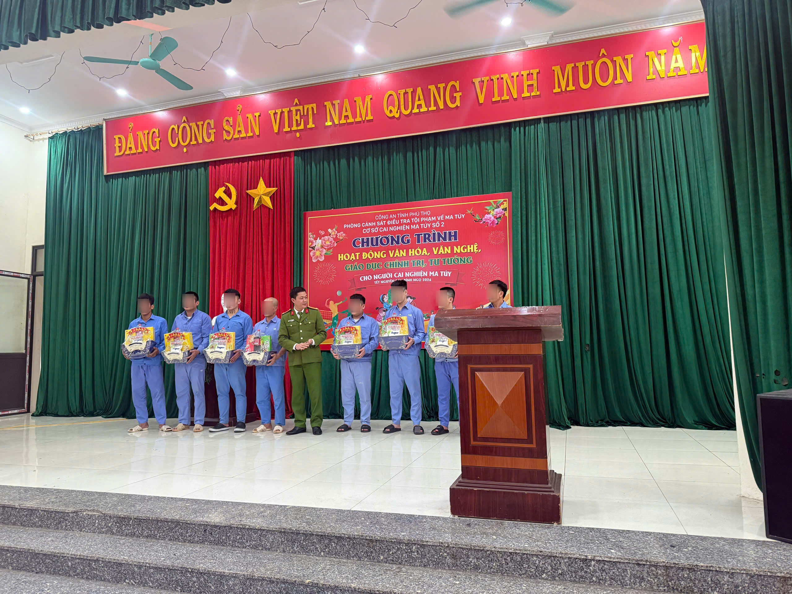 Hòa trong không khí vui tươi, phấn khởi chào đón Tết Nguyên đán Bính Ngọ năm 2026, Cơ sở cai nghiện ma túy số 2 thuộc Phòng Cảnh sát điều tra tội phạm về ma túy - Công an tỉnh Phú Thọ đã tổ chức chương trình tuyên truyền giáo dục chính trị, tư tưởng; nói chuyện chuyên đề về truyền thống Tết cổ truyền, lịch sử, văn hóa dân tộc và trao quà cho học viên, gia đình học viên có hoàn cảnh khó khăn.