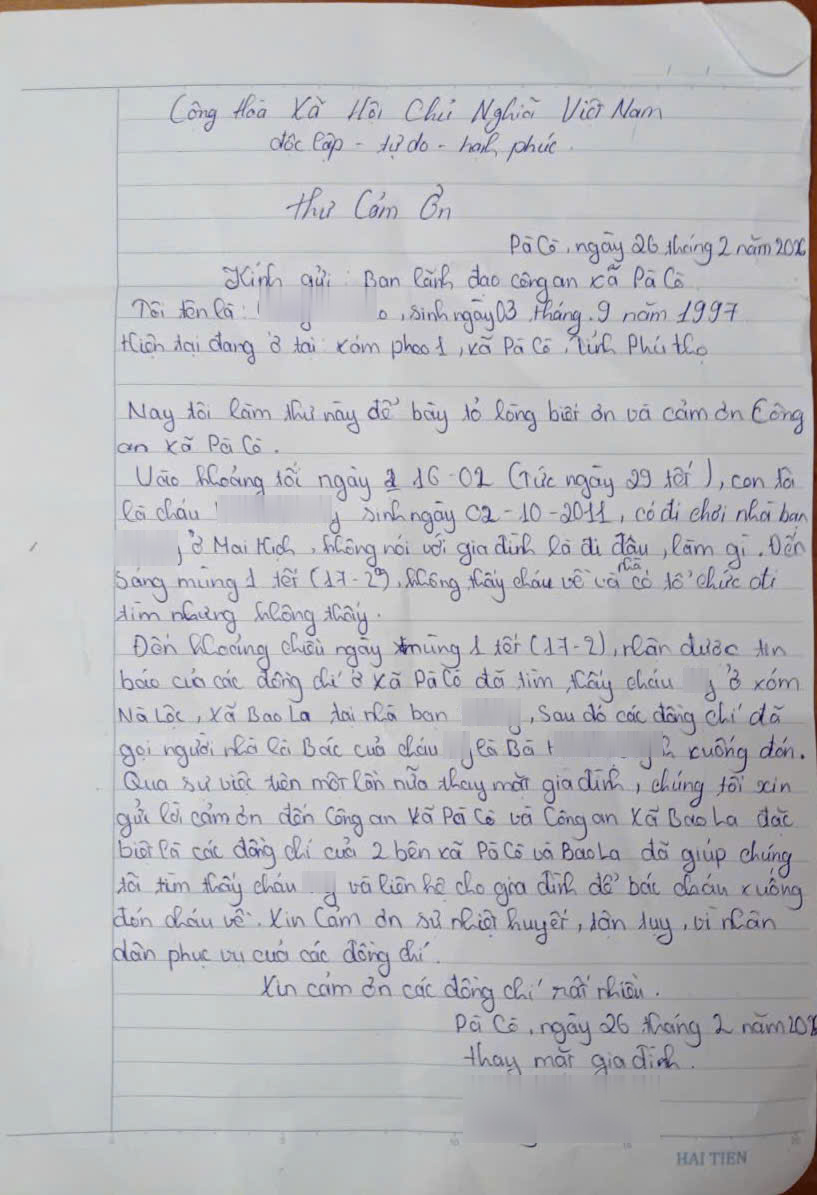 Nhận tin báo của quần chúng về việc một trẻ em mất liên lạc từ đêm Giao thừa, Công an xã Pà Cò đã khẩn trương triển khai các biện pháp xác minh, phối hợp lực lượng địa bàn giáp ranh tổ chức tìm kiếm và đưa cháu bé về gia đình an toàn ngay trong ngày mùng một Tết. Cảm kích trước tinh thần trách nhiệm của lực lượng Công an cơ sở, gia đình đã viết thư bày tỏ lòng biết ơn.