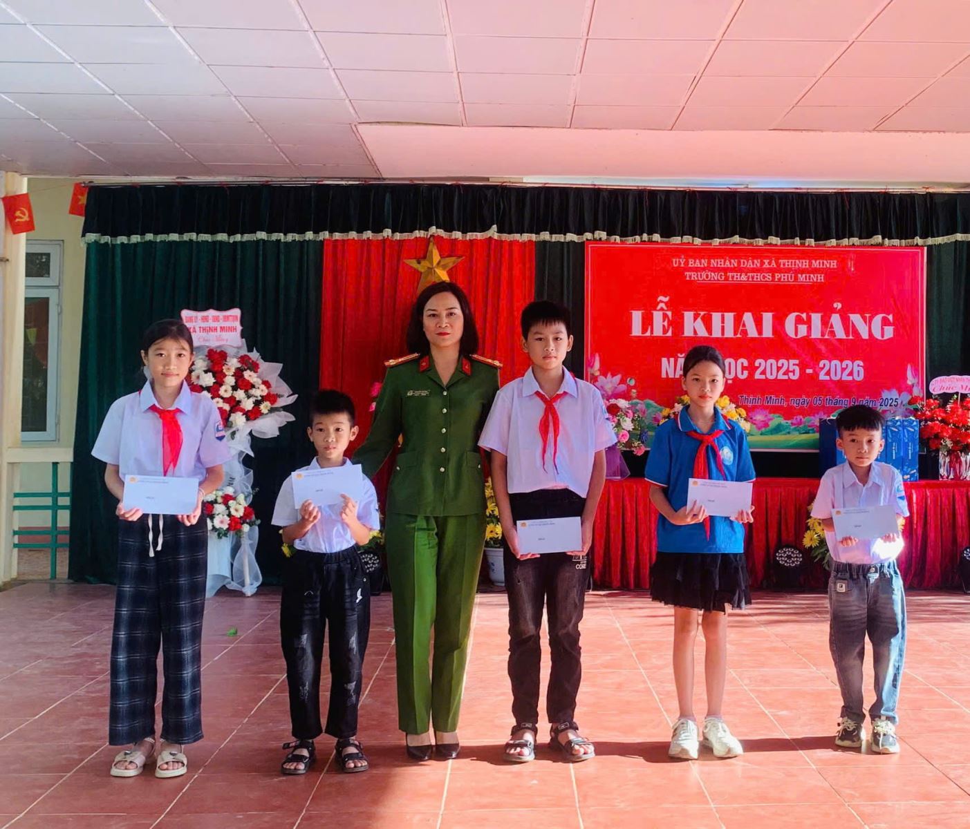 Ngày 05/9/2025, trong không khí khai giảng năm học mới 2025–2026, Công an xã Thịnh Minh phối hợp với Trường Tiểu học và Trung học cơ sở Phú Minh tổ chức trao 05 phần quà cho các em học sinh có hoàn cảnh khó khăn.