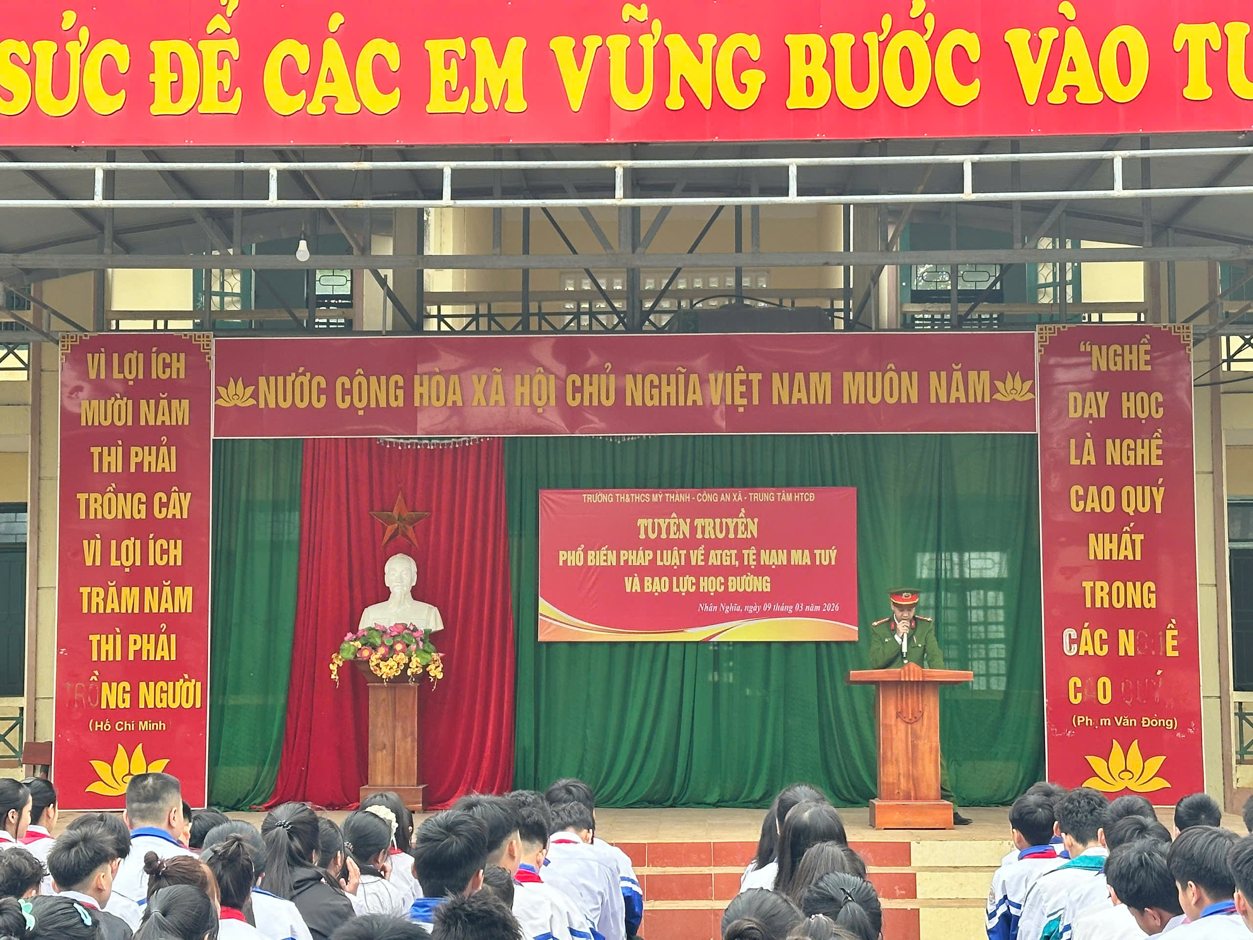 Nhằm nâng cao ý thức chấp hành pháp luật và kỹ năng phòng chống tệ nạn xã hội cho thế hệ trẻ, ngày 09/3/2026, Chi đoàn Công an xã Nhân Nghĩa đã phối hợp tổ chức buổi tuyên truyền phổ biến giáo dục pháp luật tại trường học trên địa bàn.