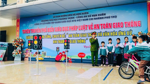 Nhằm nâng cao nhận thức, hình thành thói quen chấp hành pháp luật về trật tự, an toàn giao thông cho học sinh ngay từ lứa tuổi nhỏ, Công an xã Vạn Xuân đã phối hợp với nhà trường và doanh nghiệp tổ chức tuyên truyền, phổ biến kiến thức pháp luật về an toàn giao thông với nội dung thiết thực, phù hợp với tâm lý học sinh tiểu học.
