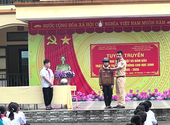 Nhằm nâng cao nhận thức, ý thức chấp hành pháp luật và đảm bảo trật tự an toàn giao thông trong lứa tuổi học sinh, sáng ngày 10/11/2025, Công an xã Liên Châu đã tham mưu Ban An toàn giao thông xã phối hợp với Phòng Cảnh sát giao thông, Công an tỉnh Phú Thọ tổ chức hội nghị tuyên truyền, phổ biến, giáo dục pháp luật về trật tự an toàn giao thông năm học 2025-2026 tại Trường THCS Hồng Châu, xã Liên Châu, tỉnh Phú Thọ.