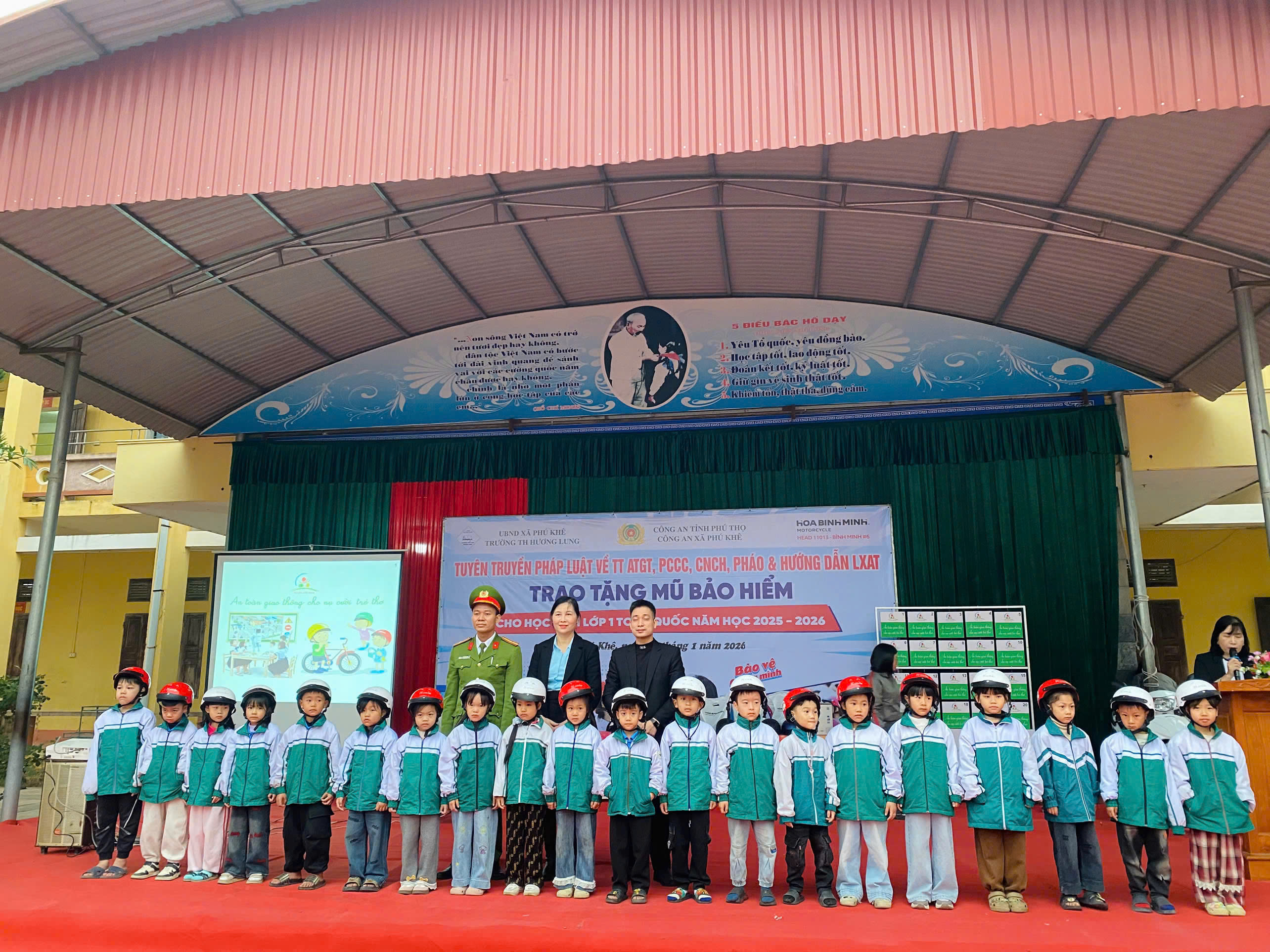 Nhằm nâng cao ý thức chấp hành pháp luật, phòng ngừa vi phạm và tai nạn trong lứa tuổi học sinh, sáng ngày 15/01/2026, Công an xã Phú Khê phối hợp với Trường Tiểu học Hương Lung và Công ty Cổ phần Xe máy Hòa Bình Minh tổ chức buổi tuyên truyền pháp luật về trật tự an toàn giao thông (ATGT), phòng cháy, chữa cháy, cứu nạn, cứu hộ (PCCC&CNCH) và quy định pháp luật về quản lý, sử dụng pháo cho giáo viên, học sinh và phụ huynh.