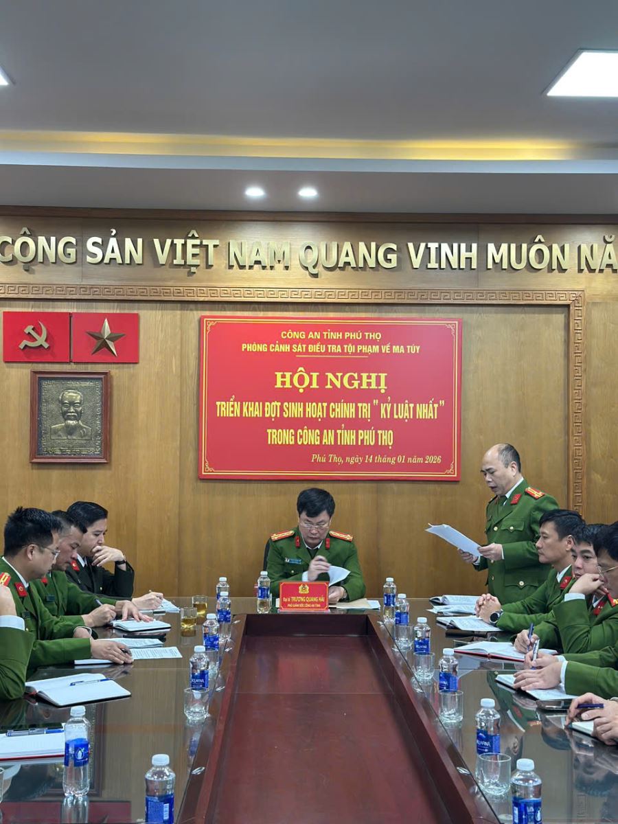 Thực hiện chỉ đạo của đồng chí Giám đốc Công an tỉnh về tổ chức đợt sinh hoạt chính trị “Kỷ luật nhất” trong toàn lực lượng Công an tỉnh, sáng ngày 14/01/2026, Phòng Cảnh sát điều tra tội phạm về ma túy đã tổ chức hội nghị triển khai đợt sinh hoạt chính trị nhằm siết chặt kỷ luật, kỷ cương, tăng cường công tác quản lý cán bộ, chiến sĩ. Tới dự và chỉ đạo hội nghị có đồng chí Đại tá Trương Quang Hải – Phó Giám đốc Công an tỉnh.