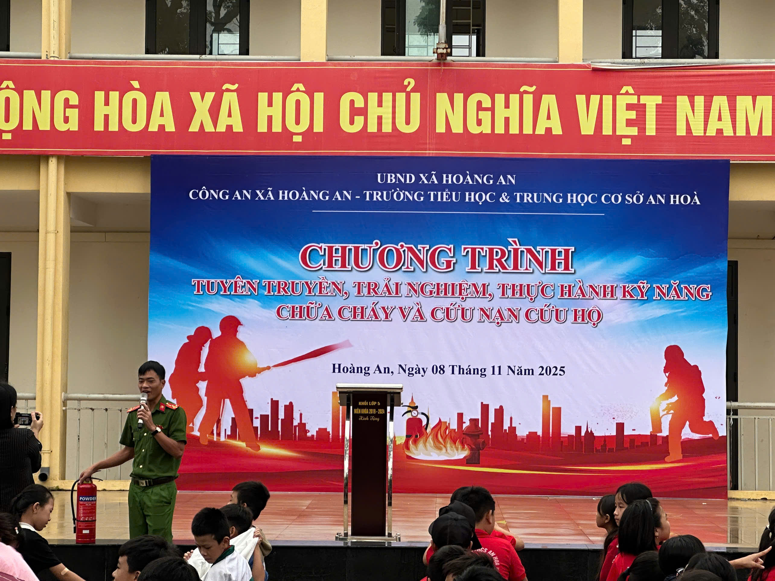 Sáng ngày 08/11/2025, Công an xã Hoàng An phối hợp với Phòng Cảnh sát Phòng cháy, chữa cháy và Cứu nạn, cứu hộ, Công an tỉnh Phú Thọ tổ chức chương trình tuyên truyền, trải nghiệm, thực hành kỹ năng phòng cháy, chữa cháy và cứu nạn, cứu hộ (PCCC&CNCH) tại Trường Tiểu học và Trung học cơ sở An Hòa, xã Hoàng An, tỉnh Phú Thọ.