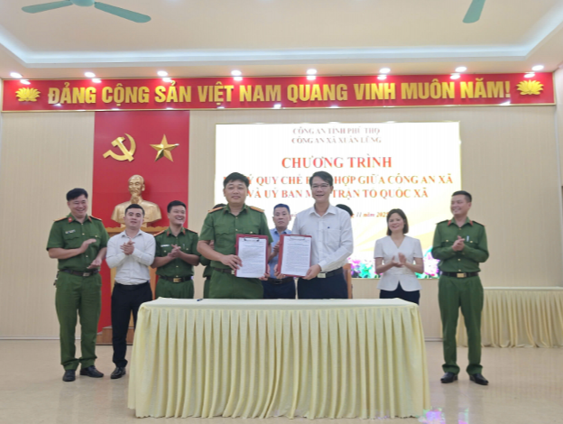 Thực hiện Chương trình phối hợp số 2018/CTrPH-CAT-MTTQ ngày 25/8/2025 giữa Công an tỉnh Phú Thọ và Ban Thường trực Ủy ban Mặt trận Tổ quốc Việt Nam tỉnh về “Đẩy mạnh phong trào Toàn dân bảo vệ an ninh Tổ quốc trong tình hình mới” giai đoạn 2025 – 2030, ngày 07/11/2025, Công an xã Xuân Lũng đã tổ chức Lễ ký kết chương trình phối hợp với Ủy ban Mặt trận Tổ quốc Việt Nam xã Xuân Lũng nhằm cụ thể hóa và triển khai hiệu quả chương trình tại địa bàn cơ sở.
