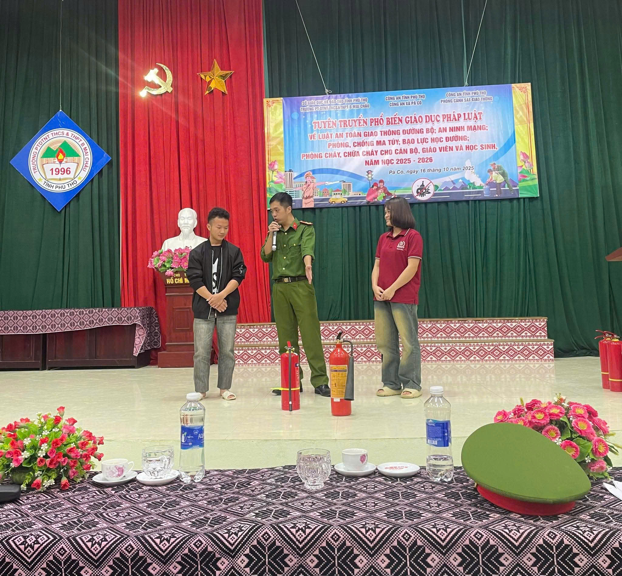 Nhằm nâng cao nhận thức, ý thức chấp hành pháp luật và kỹ năng tự bảo vệ cho học sinh, ngày 16/10/2025, Công an xã Pà Cò đã phối hợp với Phòng Cảnh sát giao thông, Công an tỉnh và Trường Phổ thông Dân tộc nội trú THCS & THPT B Mai Châu tổ chức buổi tuyên truyền, phổ biến pháp luật về an toàn giao thông, phòng chống ma túy, bạo lực học đường, an ninh mạng và phòng cháy, chữa cháy cho toàn thể cán bộ, giáo viên và học sinh nhà trường.