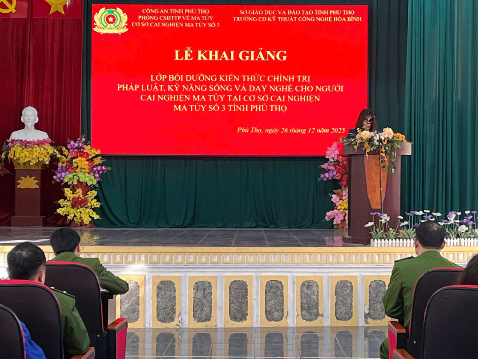 Sáng ngày 26/12/2025, Cơ sở cai nghiện ma túy số 3 tỉnh Phú Thọ tổ chức Lễ khai giảng Lớp bồi dưỡng kiến thức chính trị, pháp luật, kỹ năng sống và dạy nghề cho người cai nghiện ma túy. Đây là hoạt động được triển khai nhằm cụ thể hóa chủ trương của Đảng, chính sách, pháp luật của Nhà nước về công tác phòng, chống ma túy, đồng thời nâng cao hiệu quả công tác quản lý, giáo dục, hỗ trợ người cai nghiện trong quá trình phục hồi và tái hòa nhập cộng đồng.