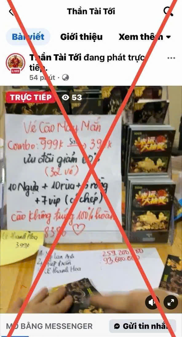 Thời gian qua, trên các nền tảng mạng xã hội xuất hiện hàng loạt các tài khoản, fanpage phát livestream lôi kéo người dân tham gia mua vé số cào trúng thưởng để lừa đảo chiếm đoạt tài sản.
