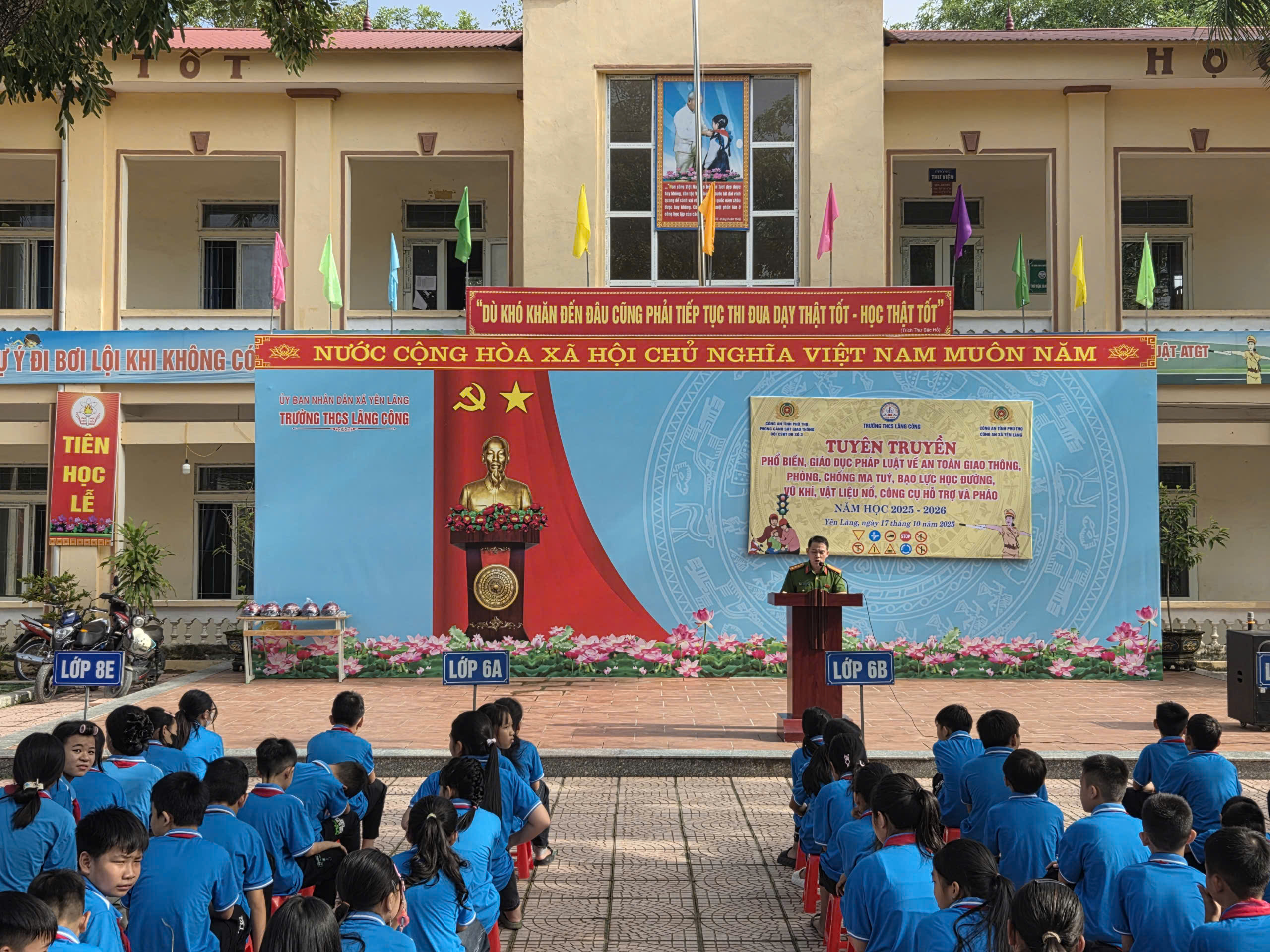 Nhằm góp phần xây dựng môi trường học đường an toàn, lành mạnh, ngày 18/10/2025, Công an xã Yên Lãng phối hợp Phòng Cảnh sát giao thông - Công an tỉnh Phú Thọ tổ chức buổi tuyên truyền, phổ biến pháp luật về an toàn giao thông đường bộ; phòng, chống bạo lực học đường và tệ nạn xã hội cho hơn 300 cán bộ, giáo viên và học sinh Trường THCS Quang Yên và Trường THCS Lãng Công.
