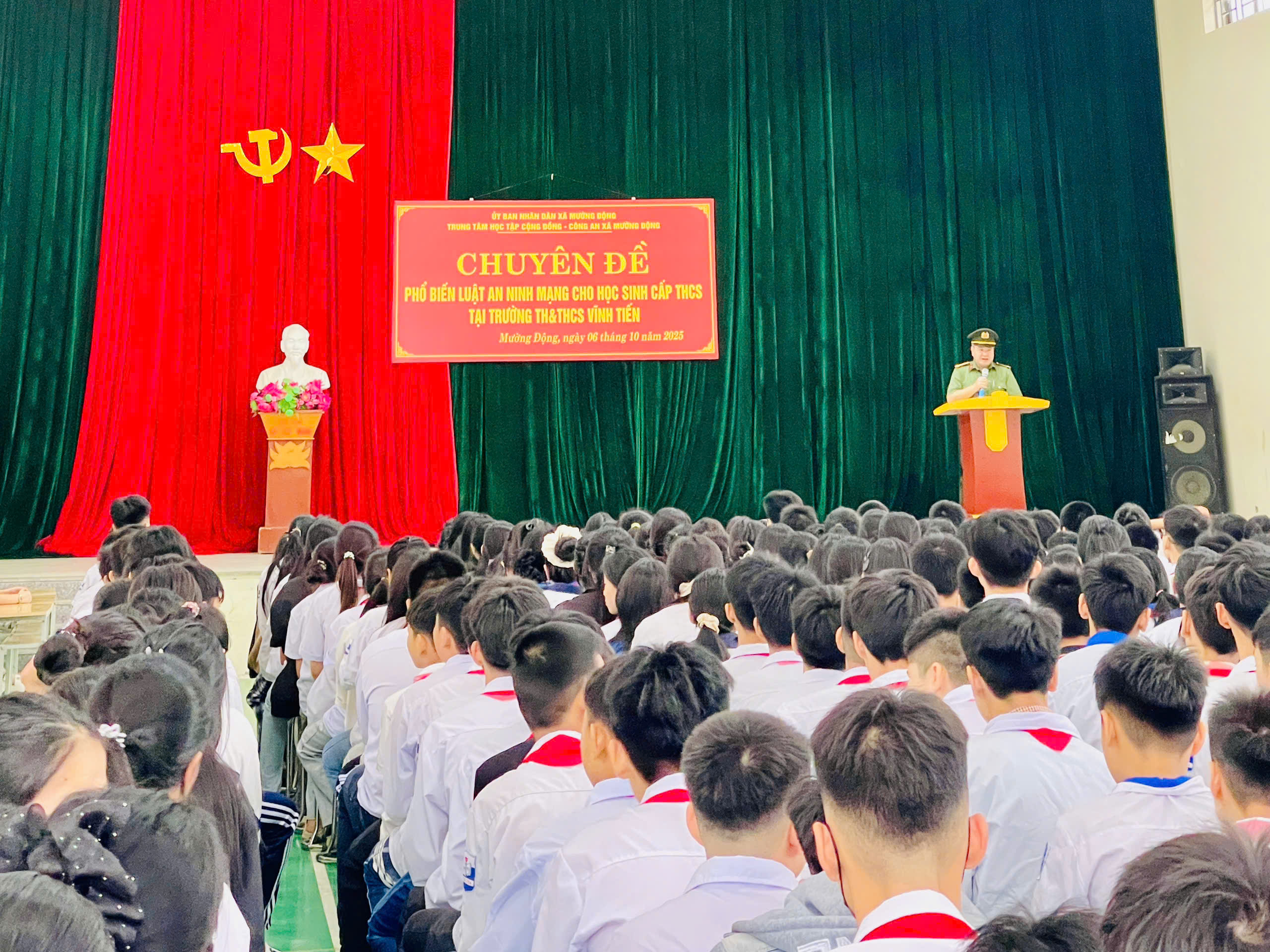 Nhằm nâng cao nhận thức, ý thức chấp hành pháp luật cho học sinh, đặc biệt là kỹ năng sử dụng mạng xã hội an toàn, sáng ngày 6/10/2025, Công an xã Mường Động phối hợp với Trường Tiểu học và Trung học cơ sở Vĩnh Tiến (xã Mường Động, tỉnh Phú Thọ) tổ chức buổi tuyên truyền, phổ biến giáo dục pháp luật chuyên đề “Luật An ninh mạng cho học sinh”.