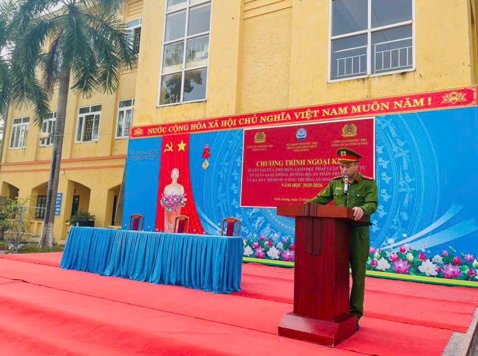 Nhằm tiếp tục tuyên truyền, giáo dục sâu rộng pháp luật về trật tự, an toàn giao thông và phòng cháy chữa cháy, hình thành văn hóa giao thông và kỹ năng xử lý tình huống khi xảy ra các vụ việc cháy nổ, tai nạn cho giáo viên, nhân viên và các em học sinh, hạn chế đến mức thấp nhất thiệt hại về người và tài sản do cháy, nổ, tai nạn giao thông gây ra, trong các ngày 29/9/2025 và 13/10/2025, Công an xã Vĩnh Tường phối hợp với Phòng Cảnh sát giao thông- Công an tỉnh Phú Thọ tổ chức chương trình ngoại khoá tuyên truyền pháp luật tại Trường THPT Lê Xoay, Trung tâm GDTX- GDNN Vĩnh Tường.